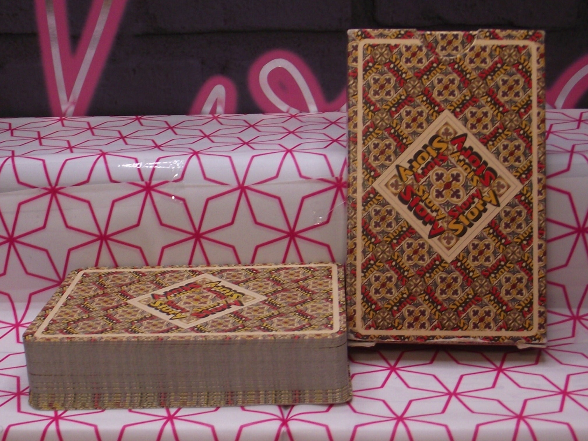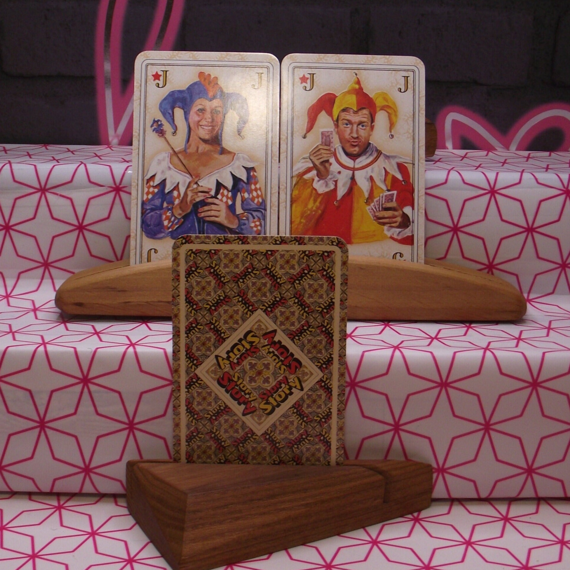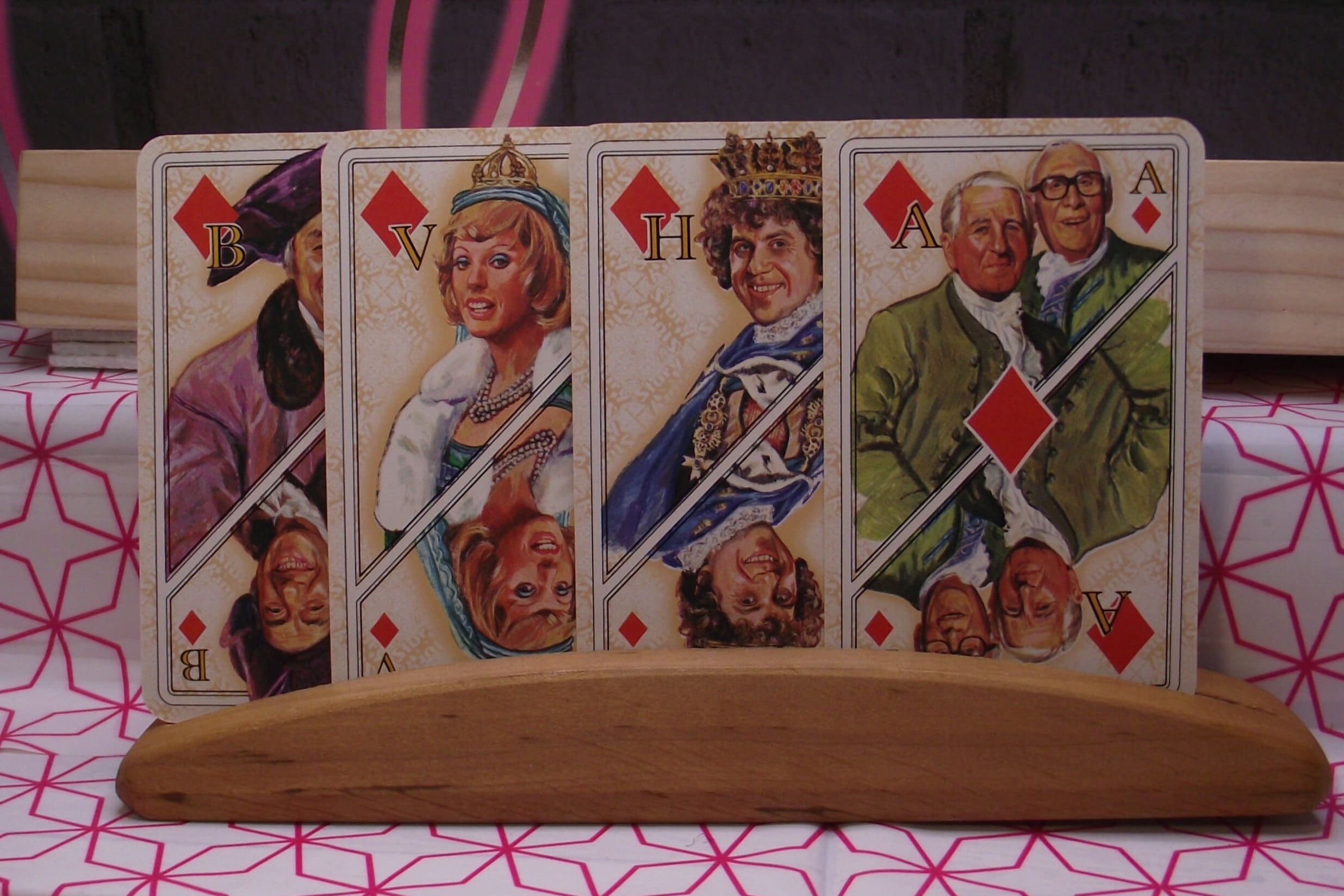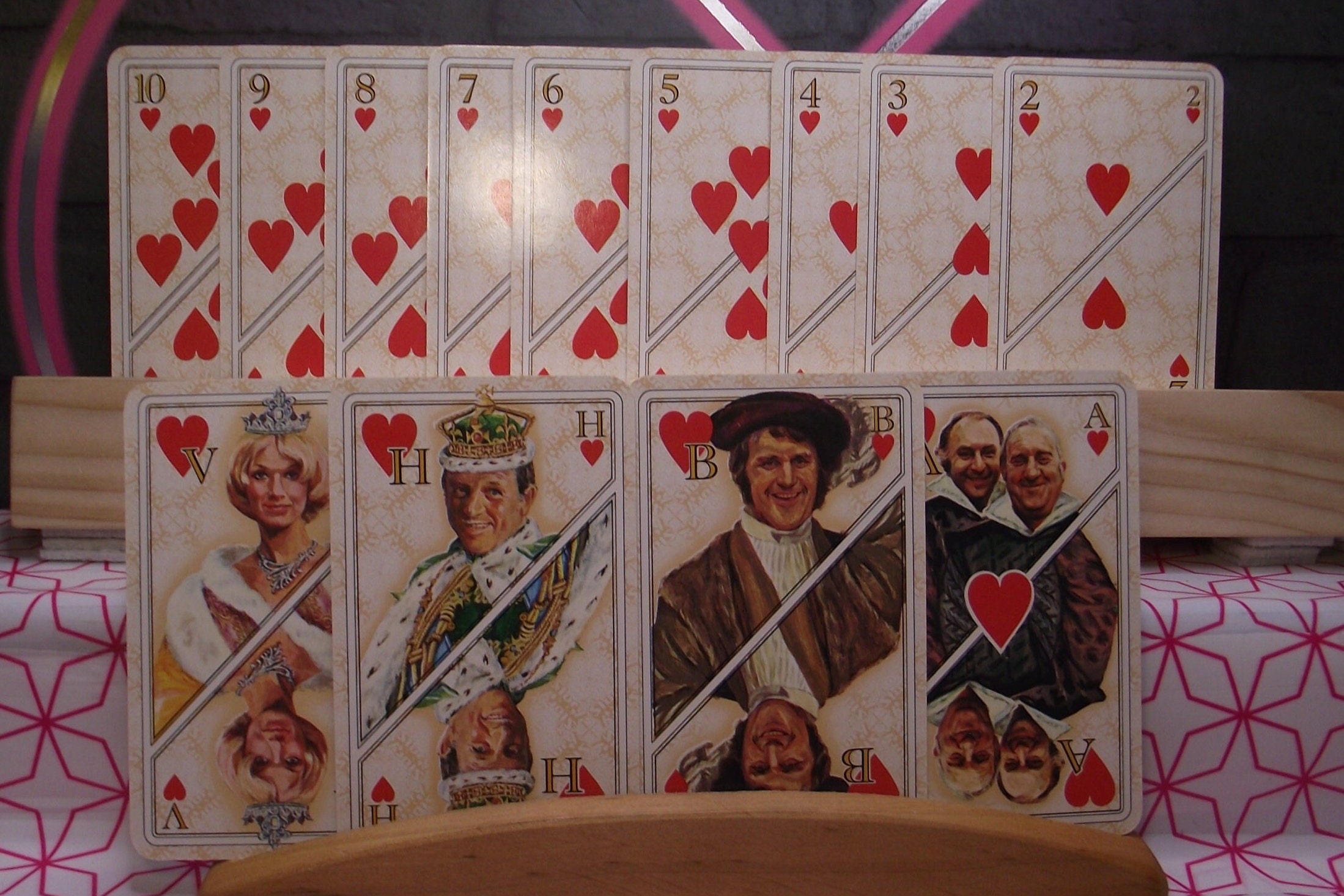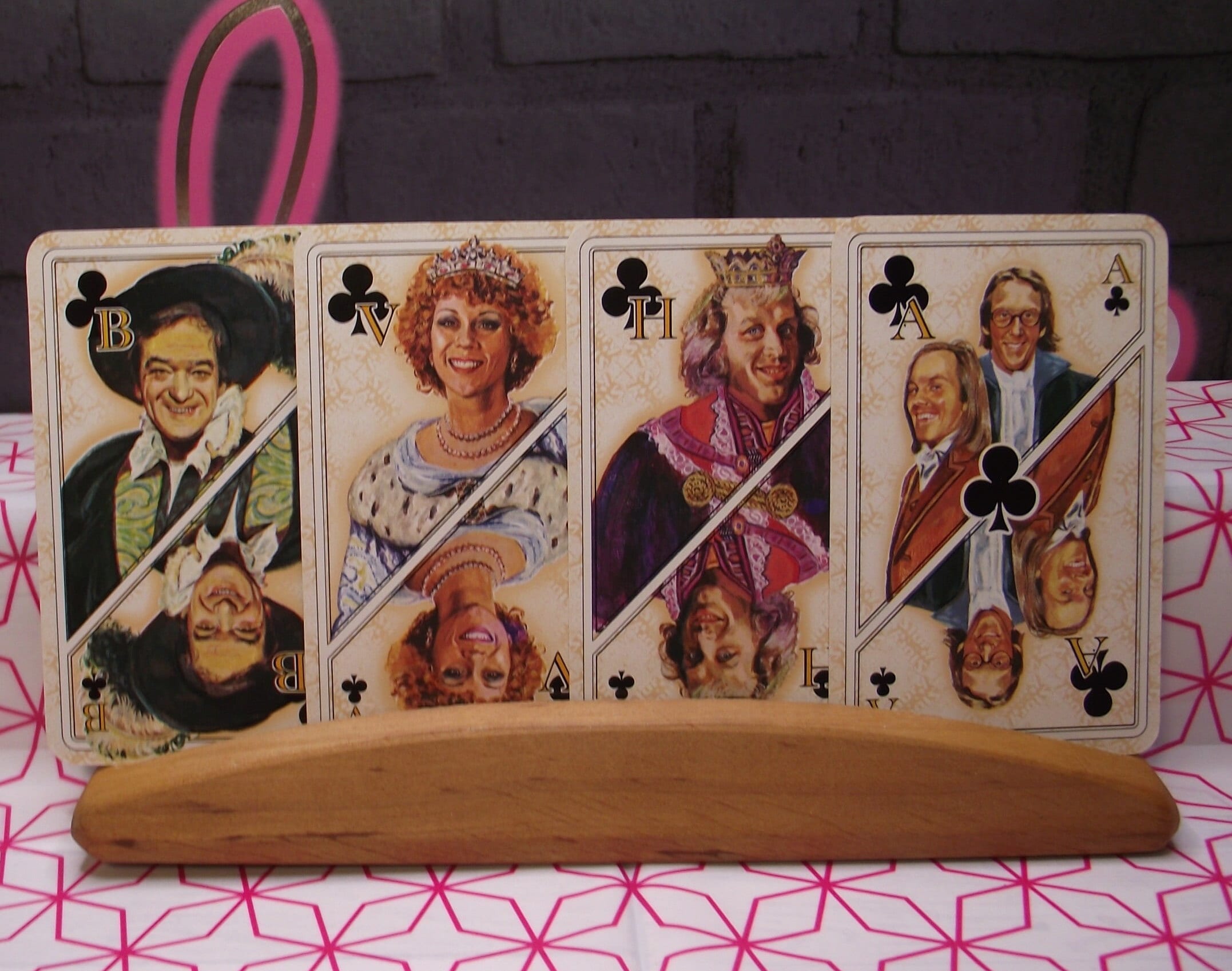 The jokers, court cards and Aces show illustrations of celebrities dressed in beautiful royal clothing, the card game was made in around 1978 by Carta Munid. Not a standard deck.