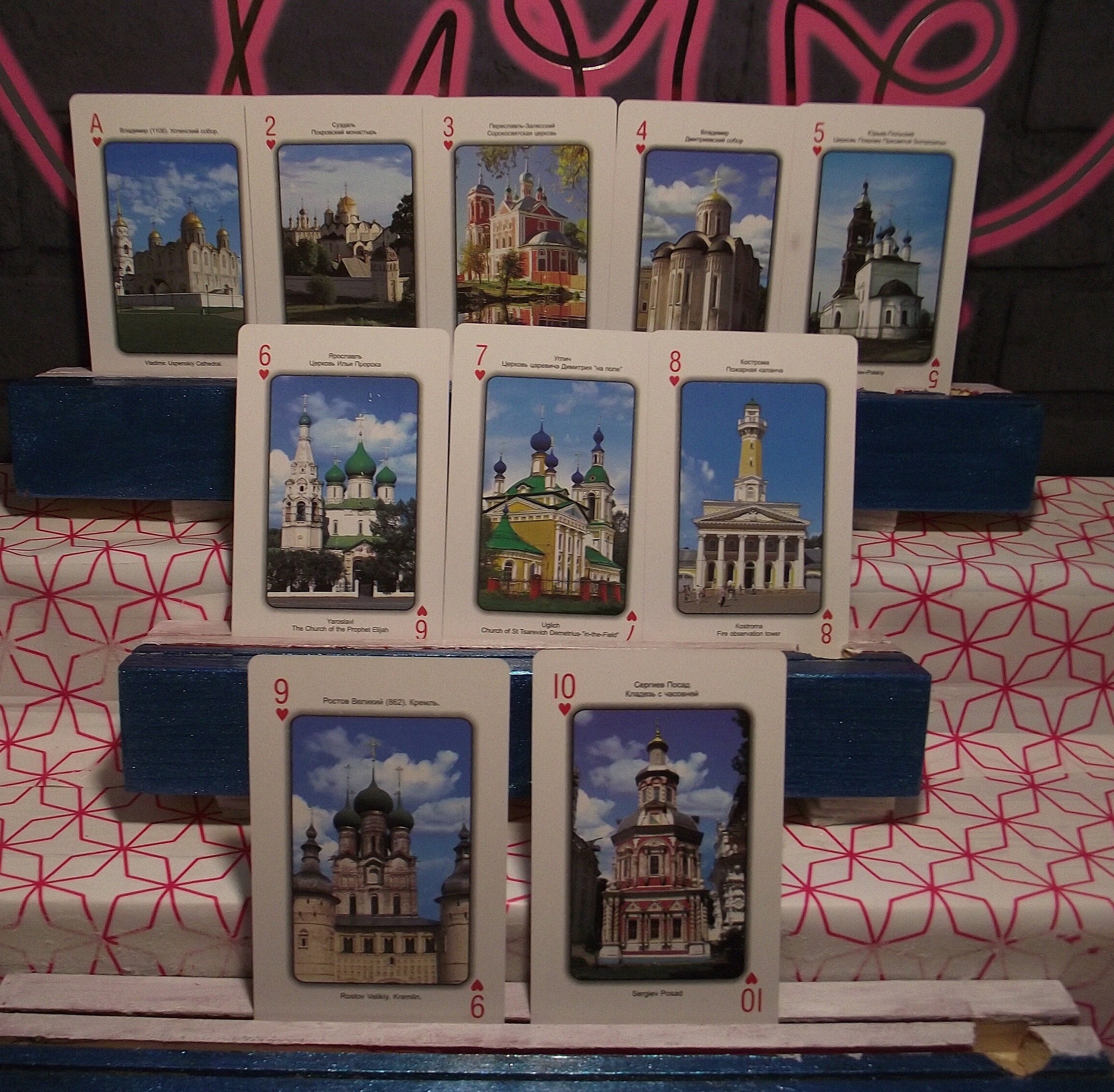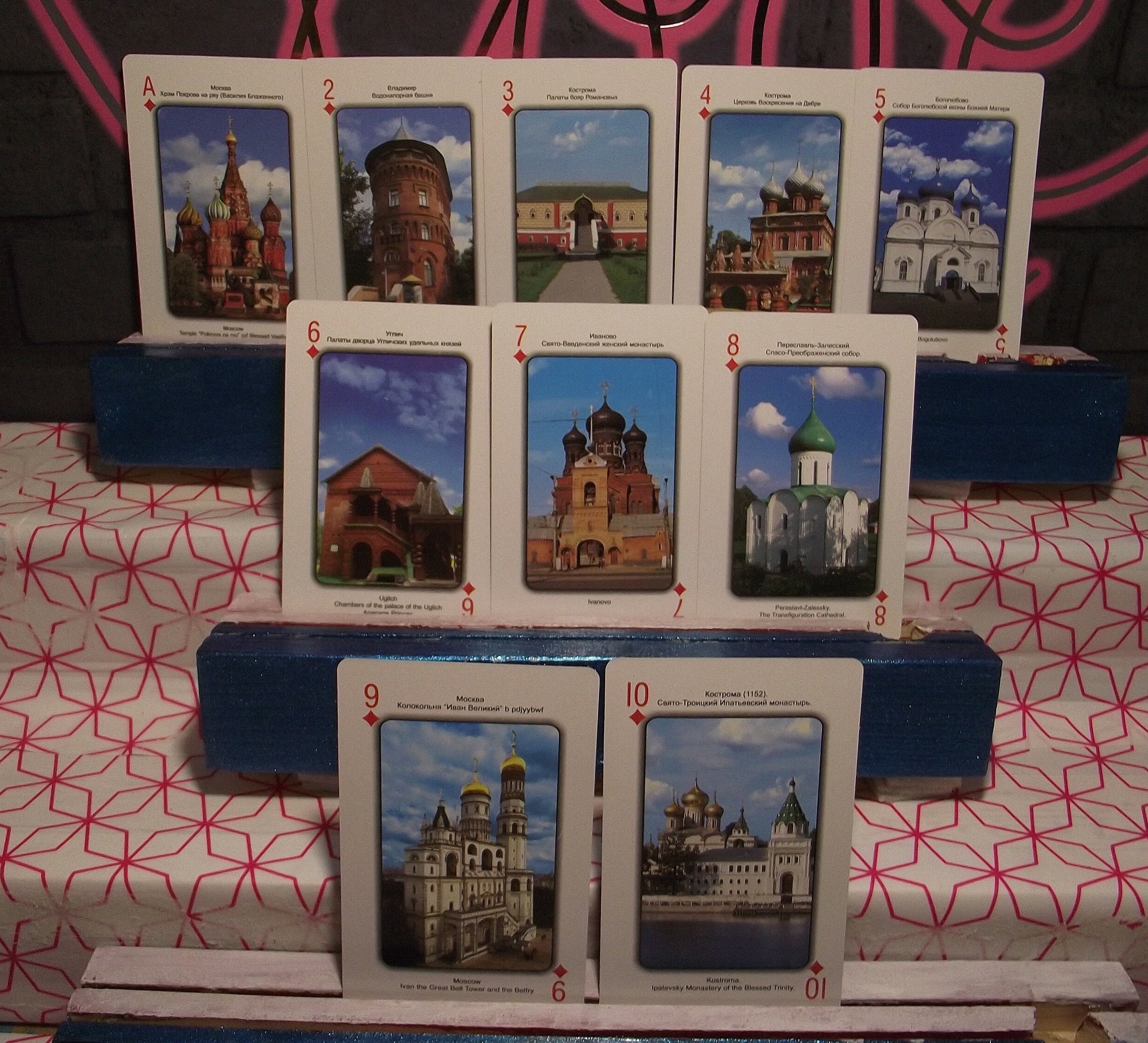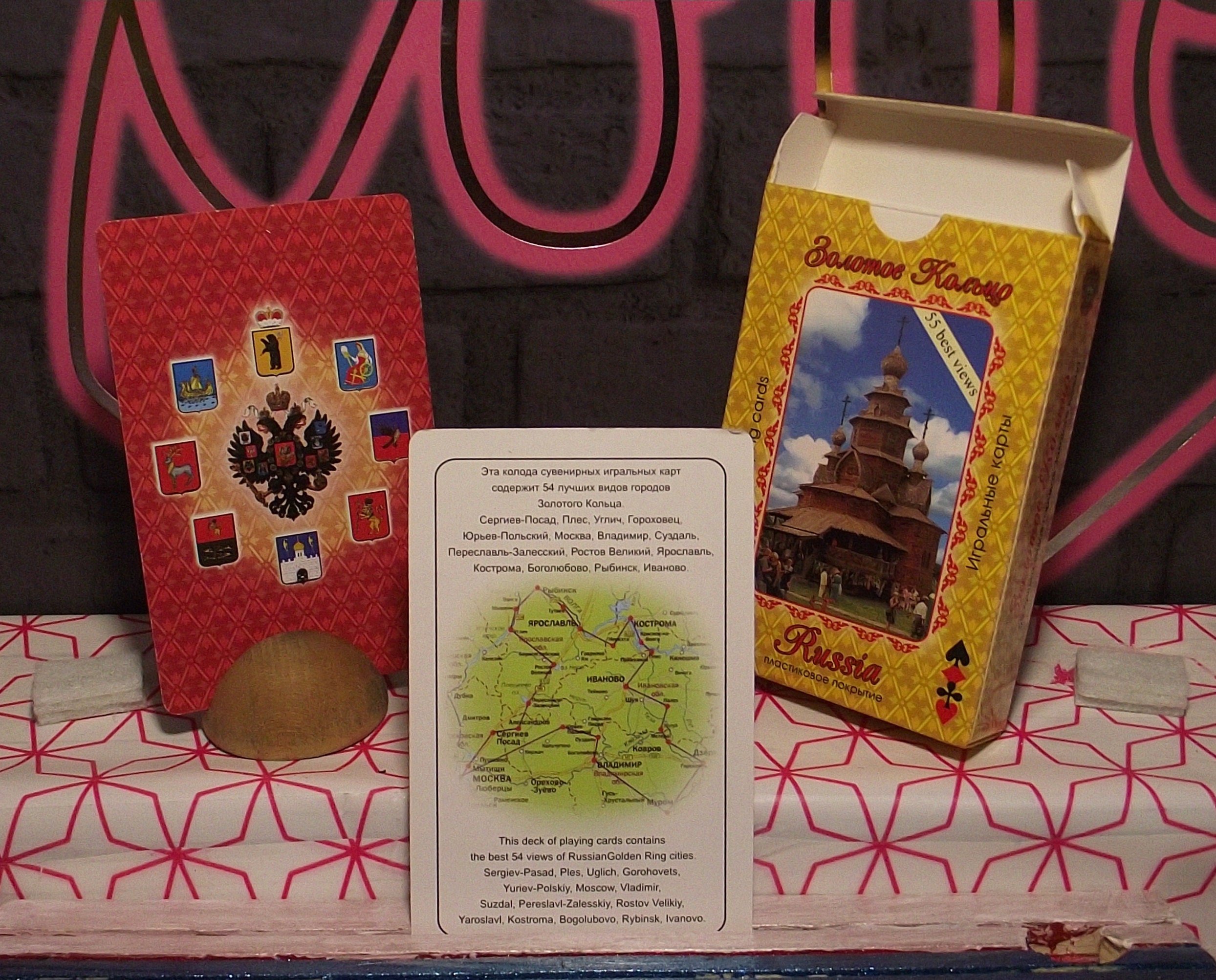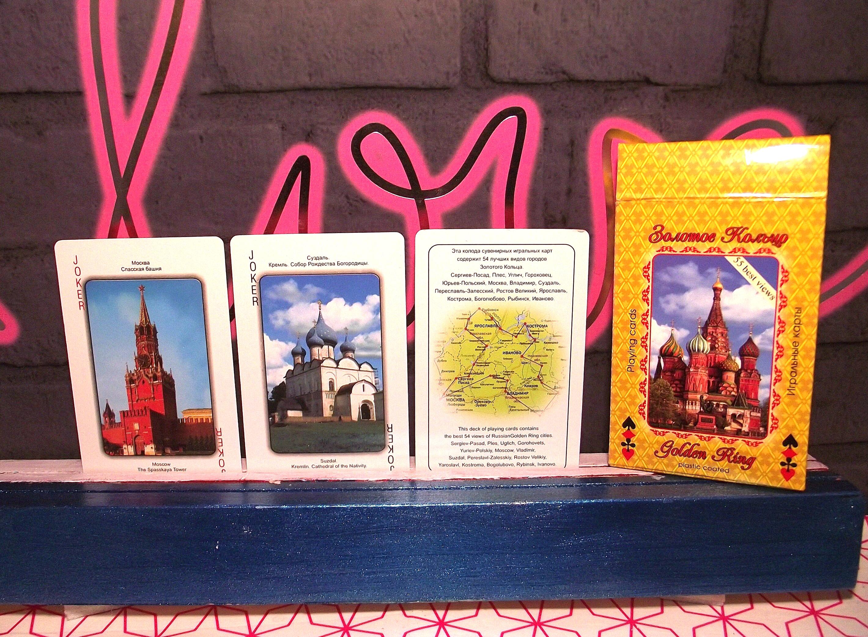 Souvenir playing cards - Russia - It contains 54 cards with views of Russia's Golden Ring cities. Sergiev-Pasad, Ples, Uglich, Gorohovets, Yurlev-Polskly, Moscow, Vladimir, Suzdal,Pereslavi-Zalessky, Rostov Velikly, Yaroslavi, Kostroma, Bogolubovo, Rybinsk, Ivanovo.