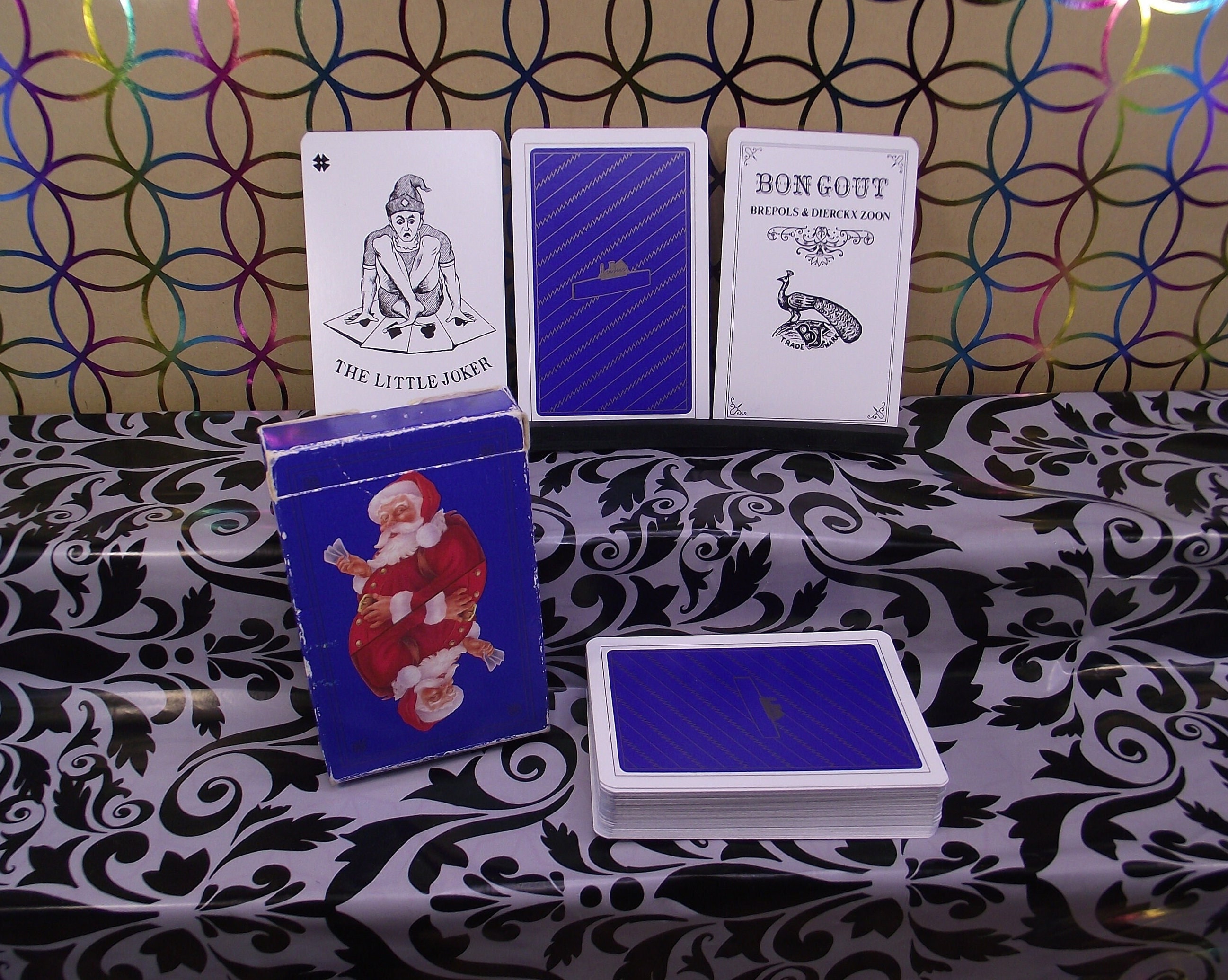 This is an advertising deck for a bank. There is a Santa Claus on the box, and the words credit and banker are legible. The bongoût type is one of the most popular and striking packs made by Turnhout card makers. These playing cards are provided with special landscape Aces and the court cards are also very nicely illustrated.
