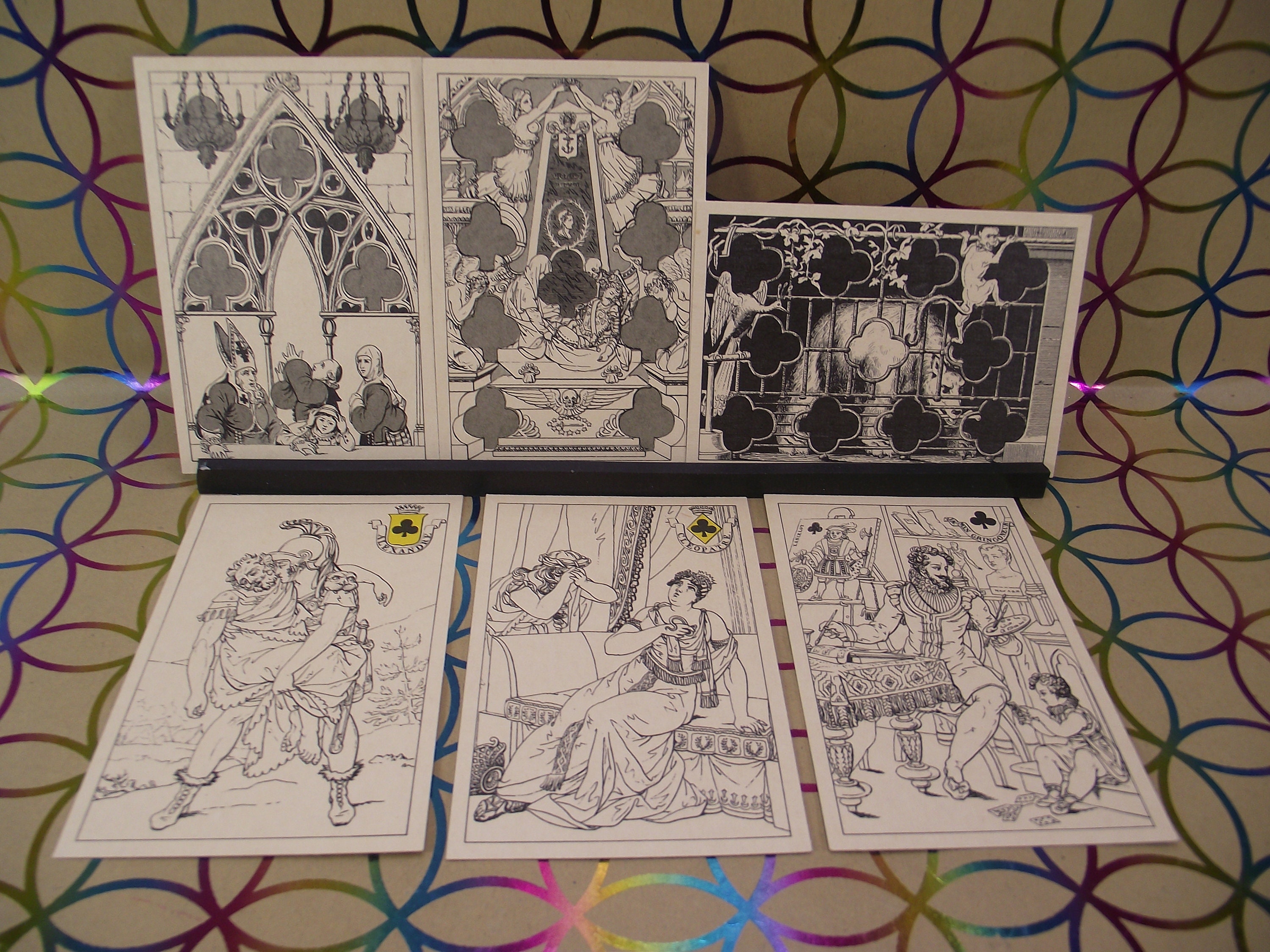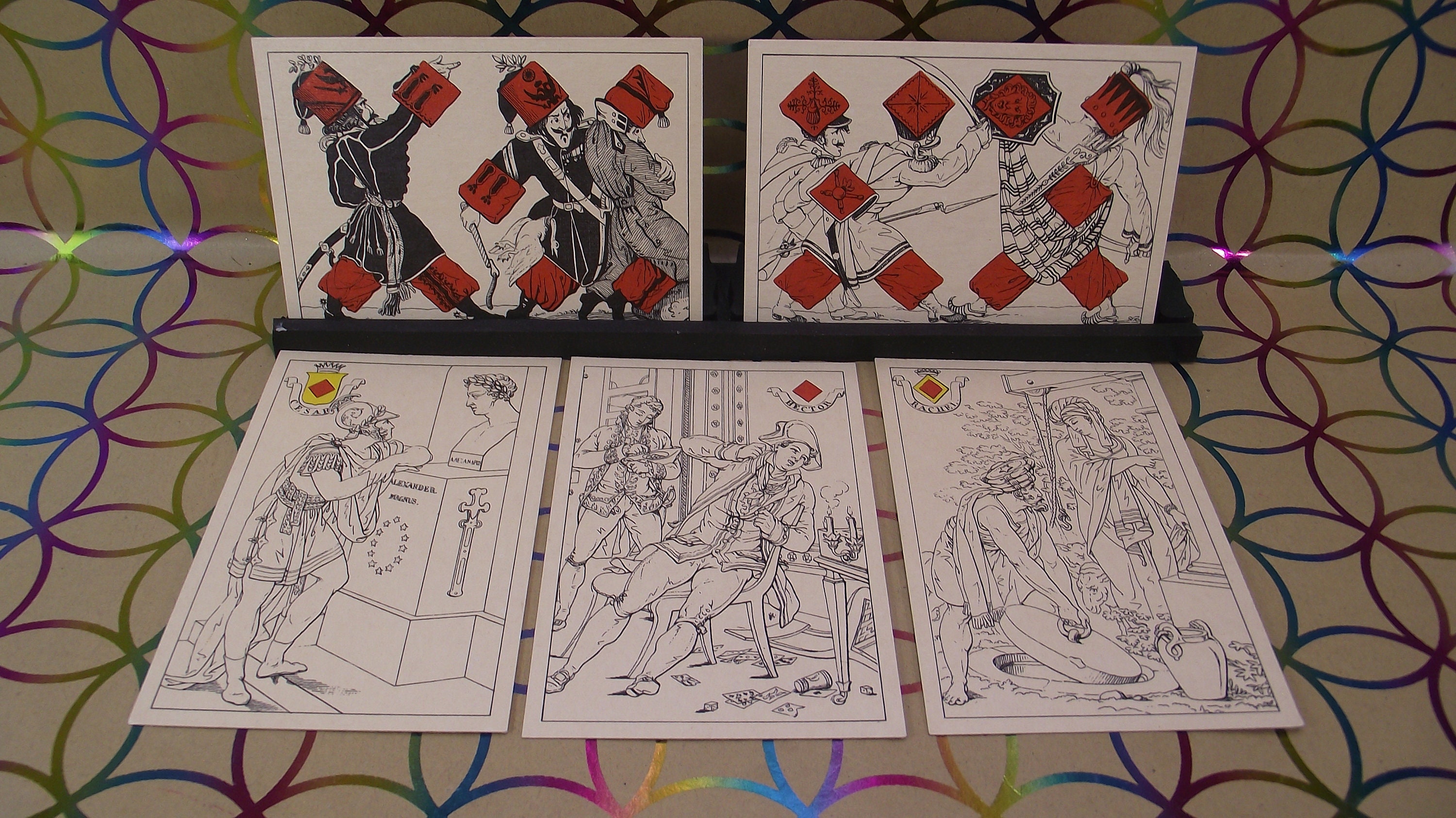 This type of playing cards is known for its critical undertone and ironic view of the times. Colonel ATHALIN, officer at the court of Louis Phillipe, designed this game. Hearts suit: Charlemagne, Judith and Harlequin. Clubs: Alexander, Cleopatra and Jacquemin Gringoneur. For diamonds: Caesar, Rachel and Hector. And spades: David, Pallas, Hogier. Each card depicts an important episode from the life of the heroes.