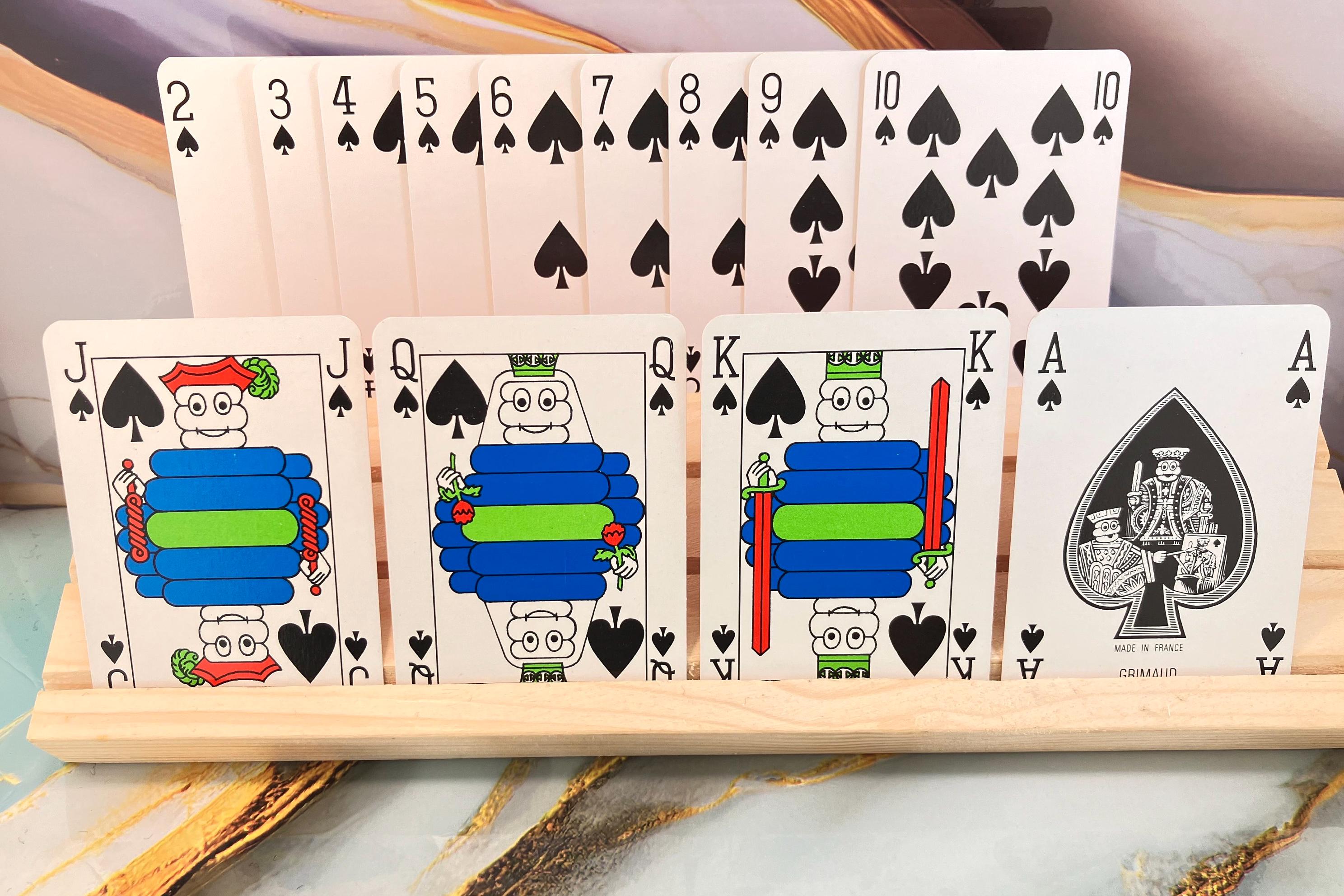This deck was made by Grimaud I assume in about 1980. The deck has 52 cards and is complete. The ace of spades has a unique pattern as do the court cards, the jack, the queen and the king.