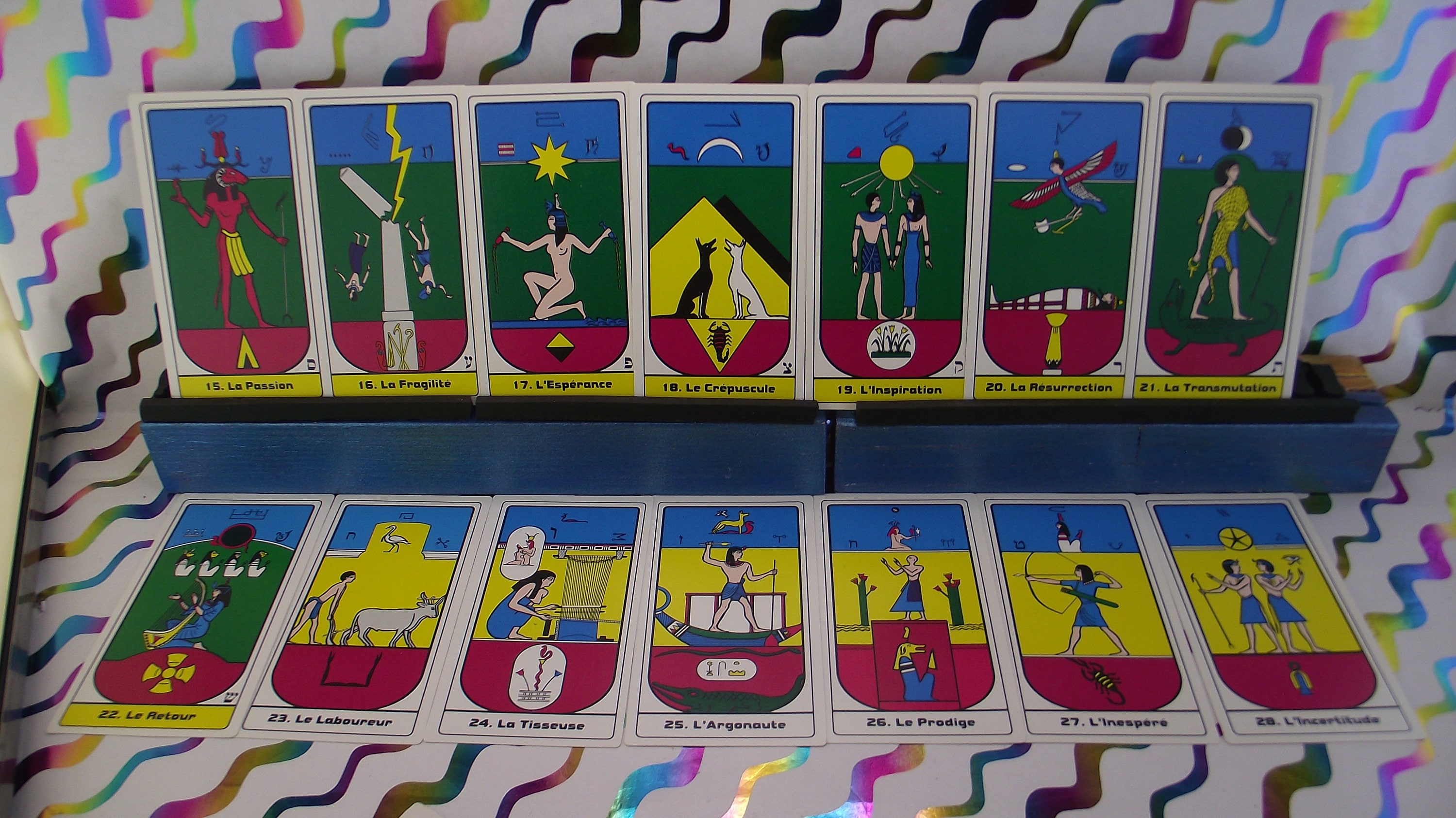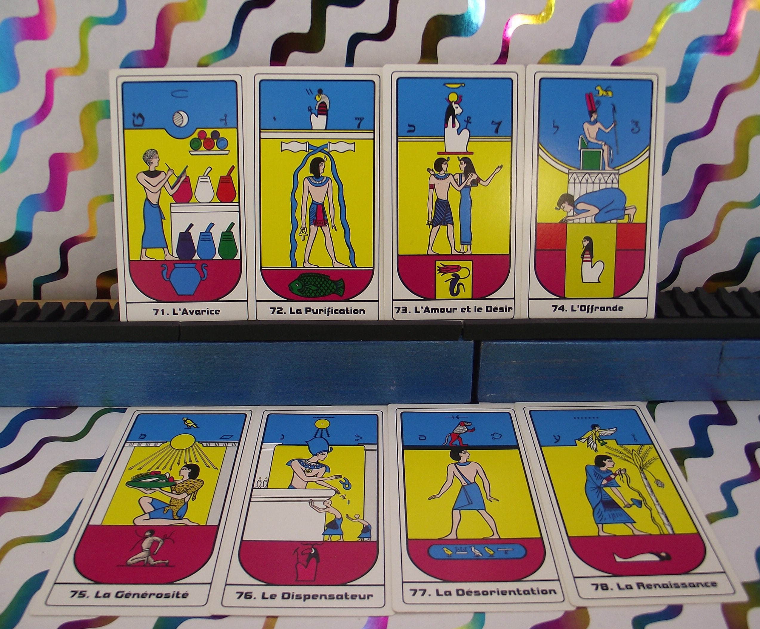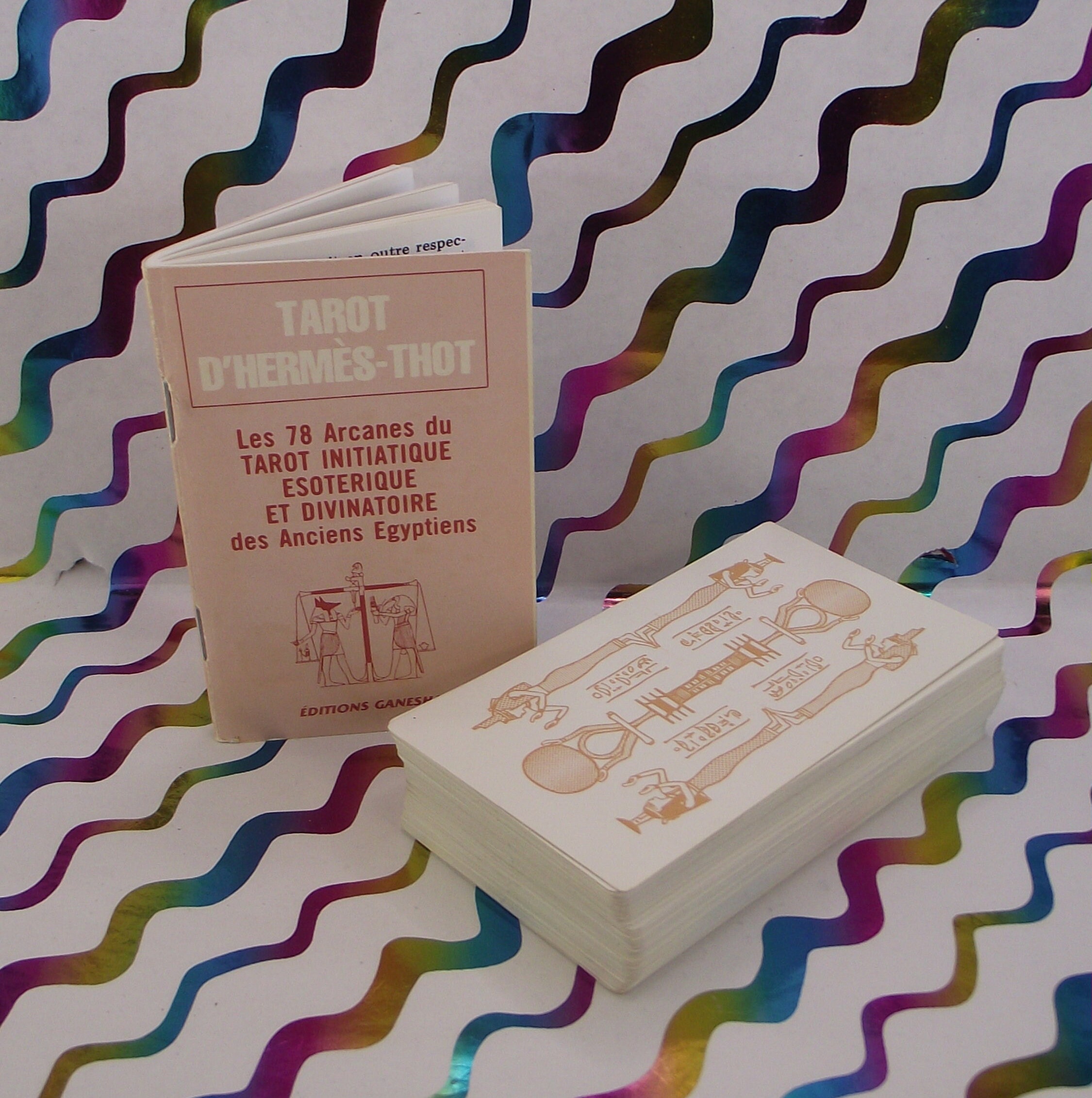Beautiful deck with colorful illustrations of Egyptian symbols. AGIRA is an abbreviation of: L'ASSOCIATION GNOSTIQUE INTERNATIONAL DE RECHRICHE ANTHROPOLOGIA. KLEURRIJKE ILLUSTRATIRS.