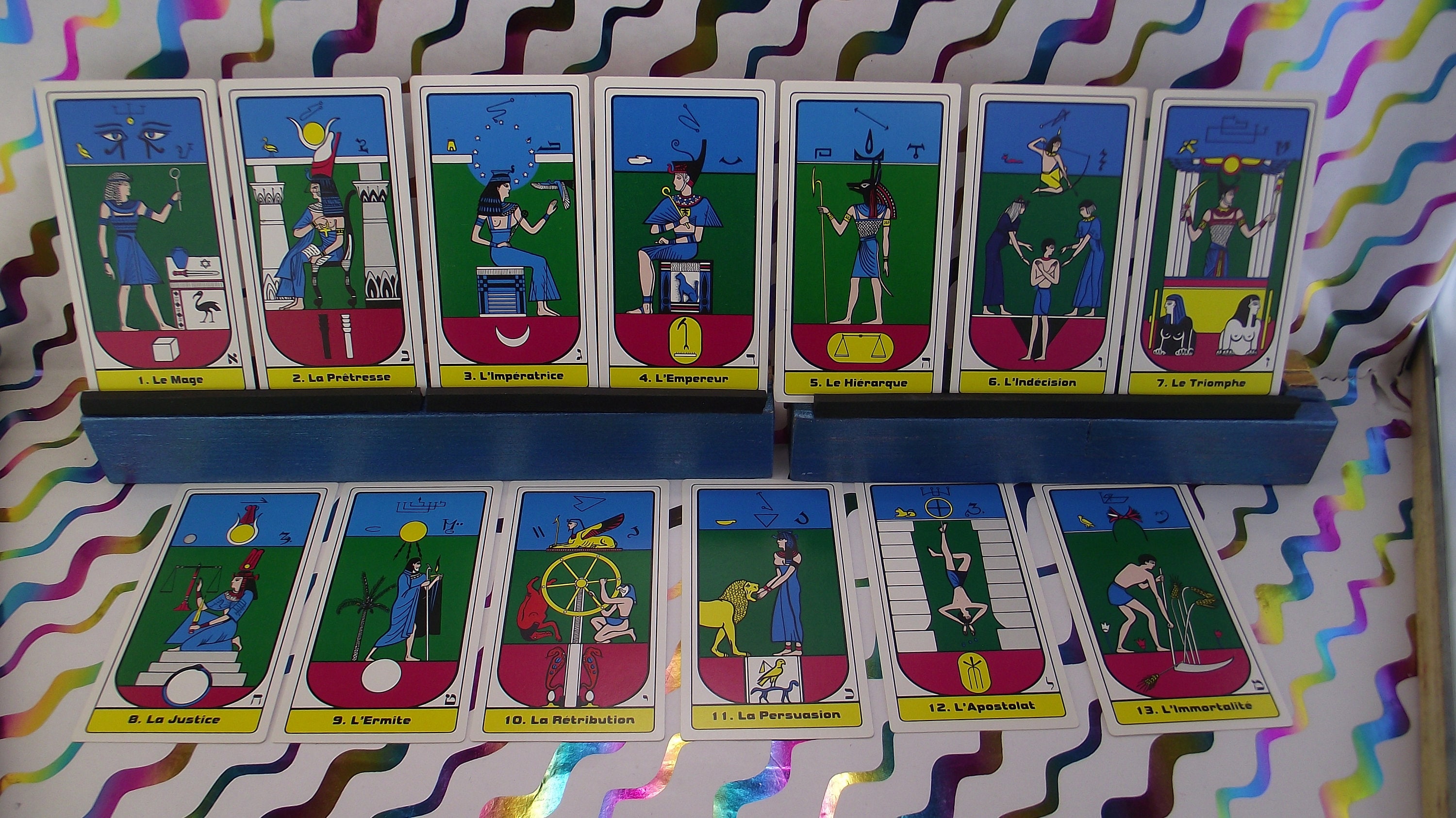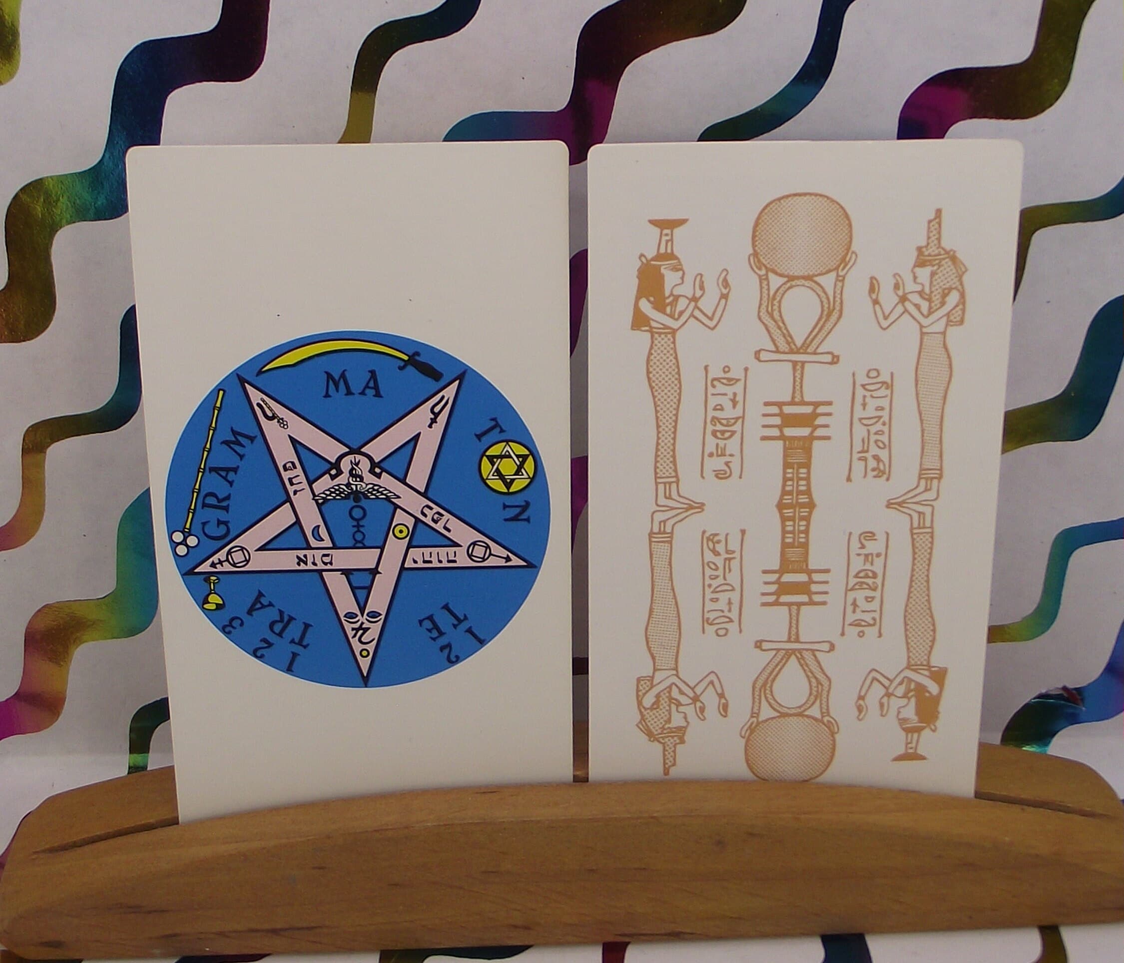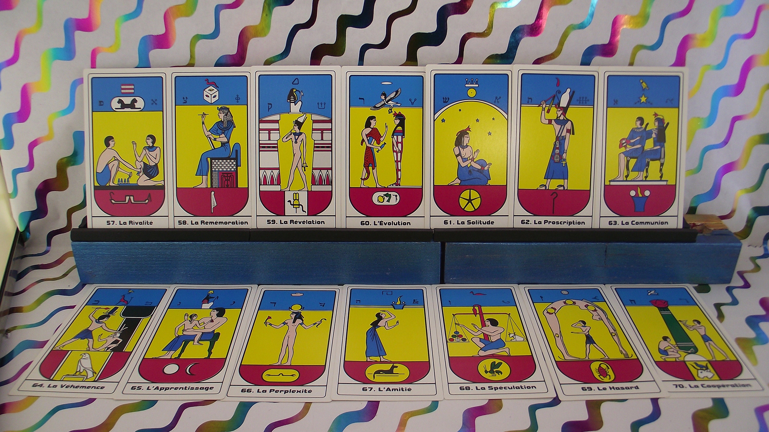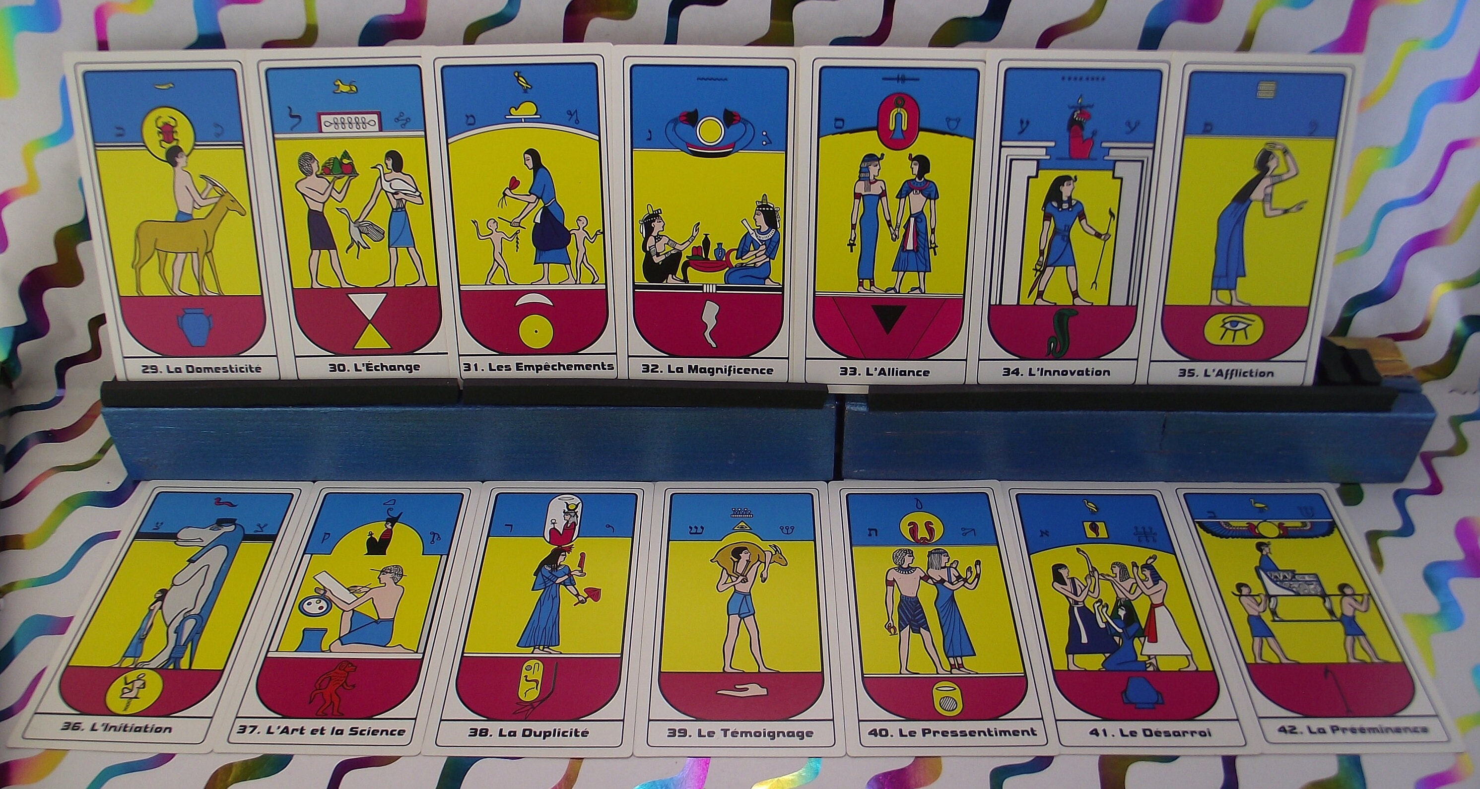 Beautiful deck with colorful illustrations of Egyptian symbols. AGIRA is an abbreviation of: L'ASSOCIATION GNOSTIQUE INTERNATIONAL DE RECHRICHE ANTHROPOLOGIA. KLEURRIJKE ILLUSTRATIRS.
