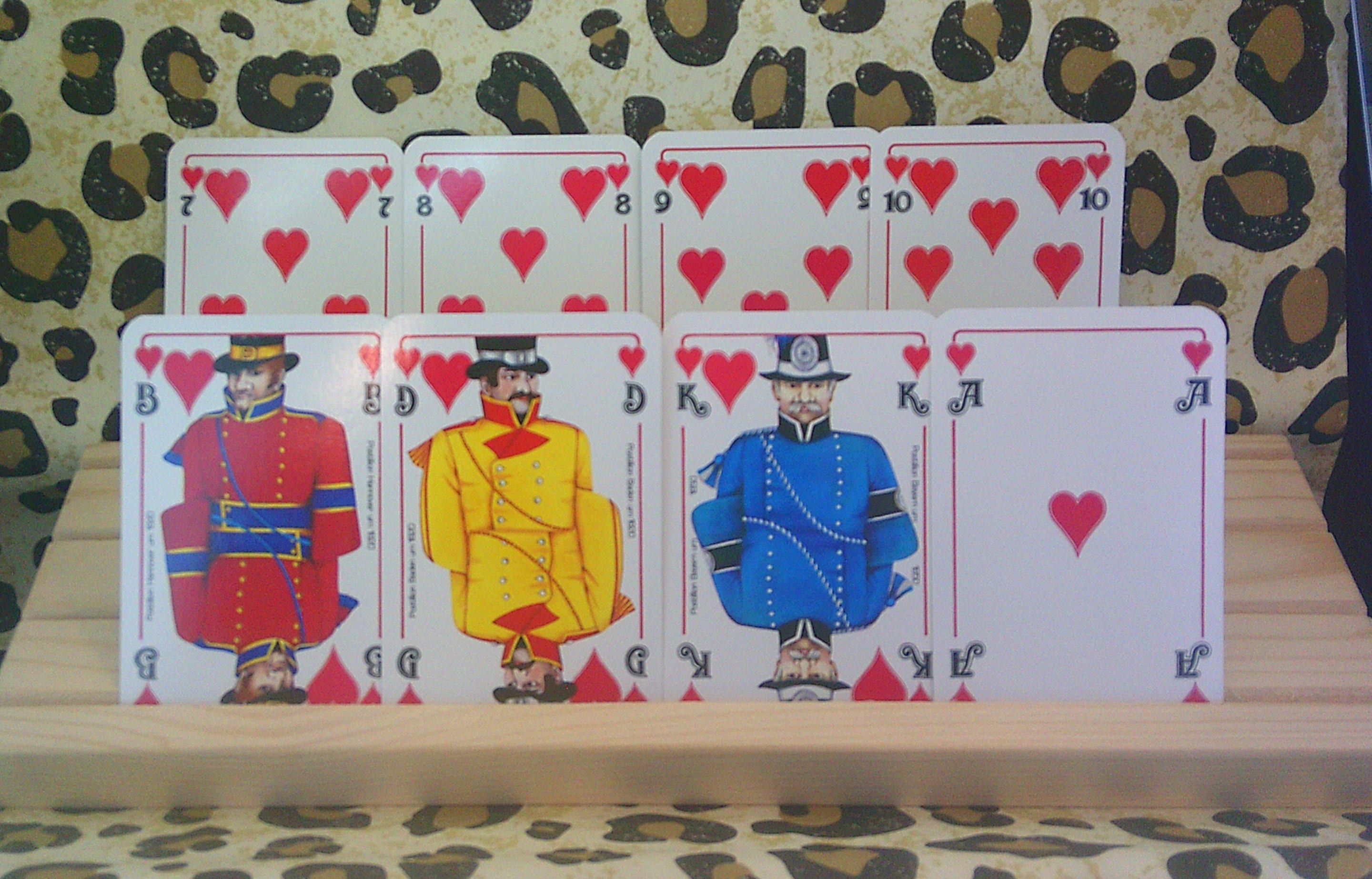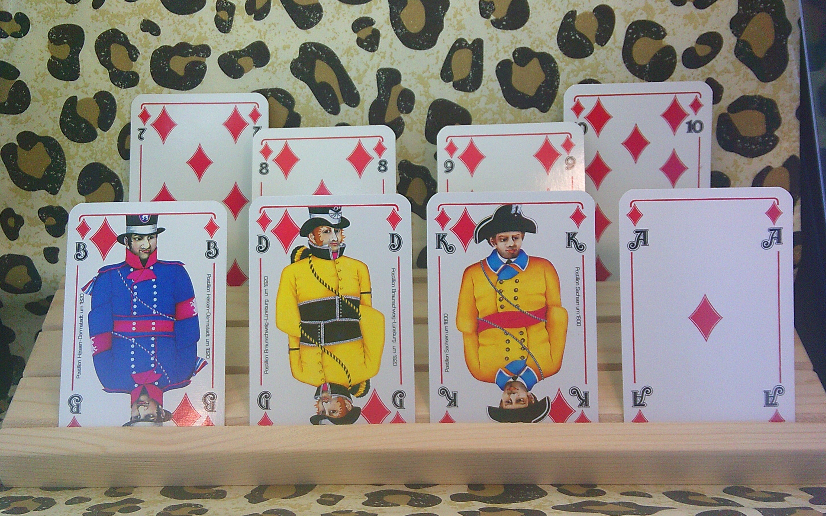 Deutsche Post exists 500 years and they released this card game in honor of this. © ARTWORK MARKETING. Illustrations by Monika Dostler. The number cards and aces are normal, the court cards show the uniforms that were worn by the Deutsche Post in certain periods from the year 1800 to 1845.