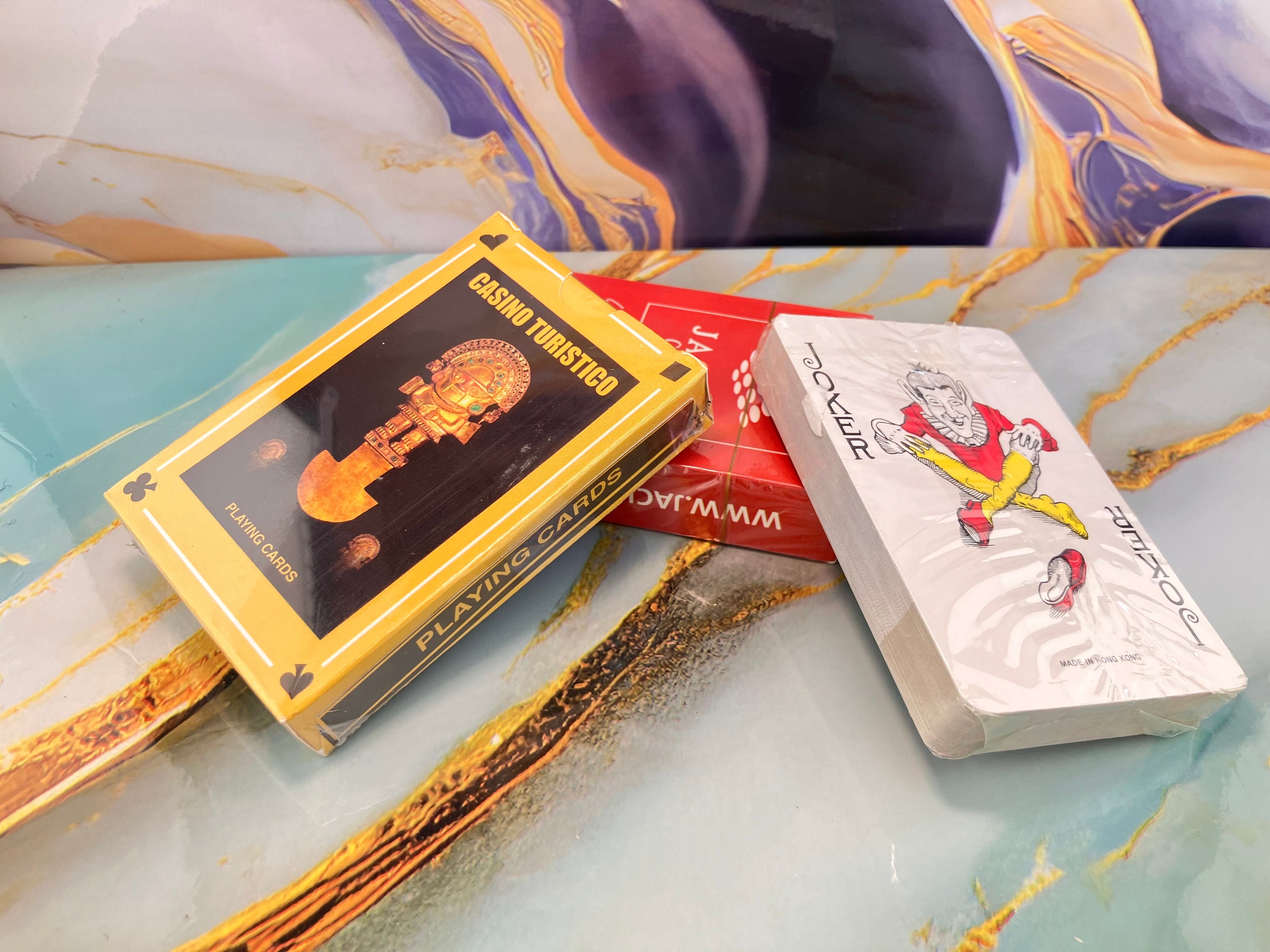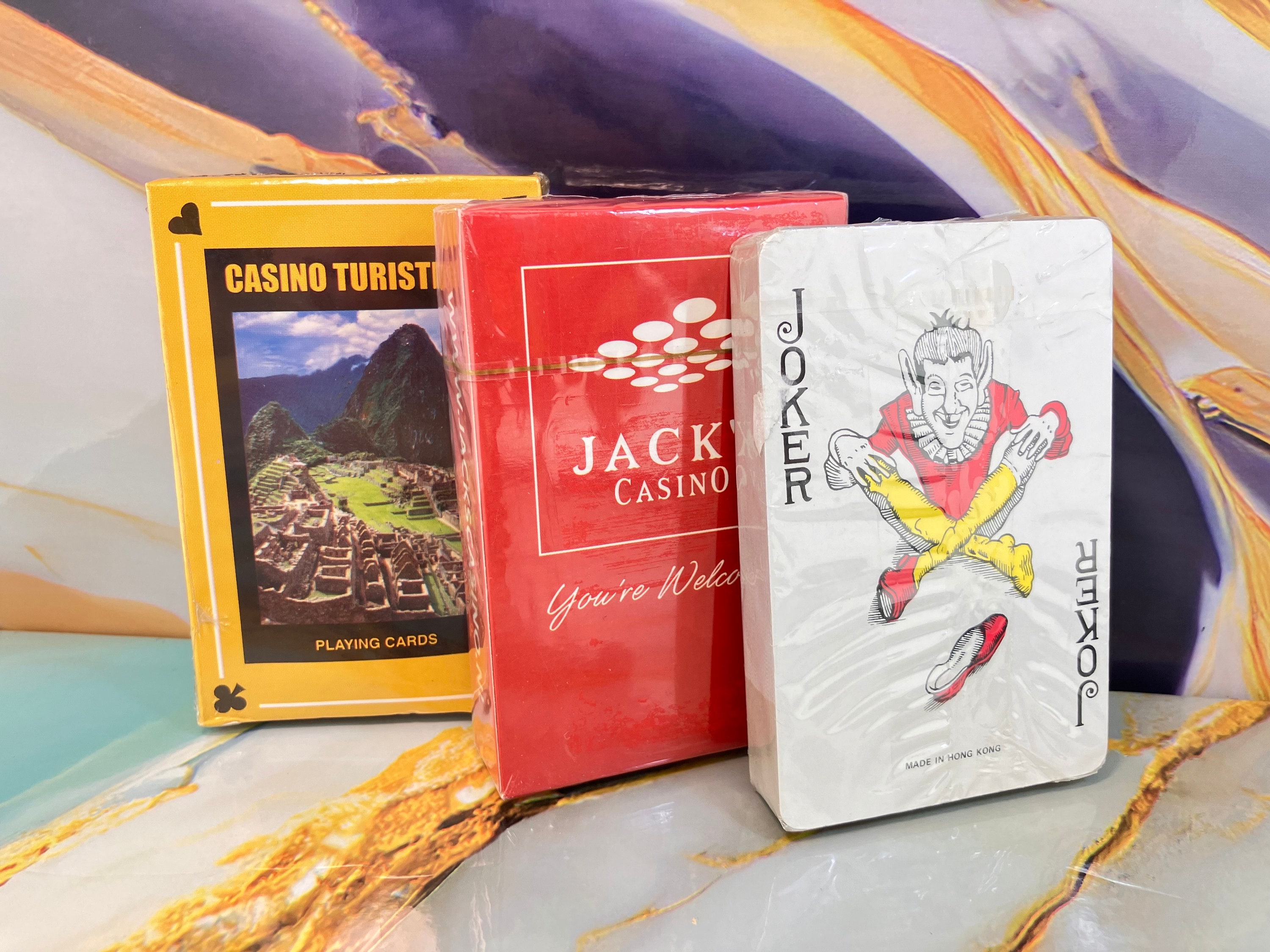 3 different decks with casino advertising. In seal. Unknown image. Unused and unknown makers. Vintage from around the 1980s.