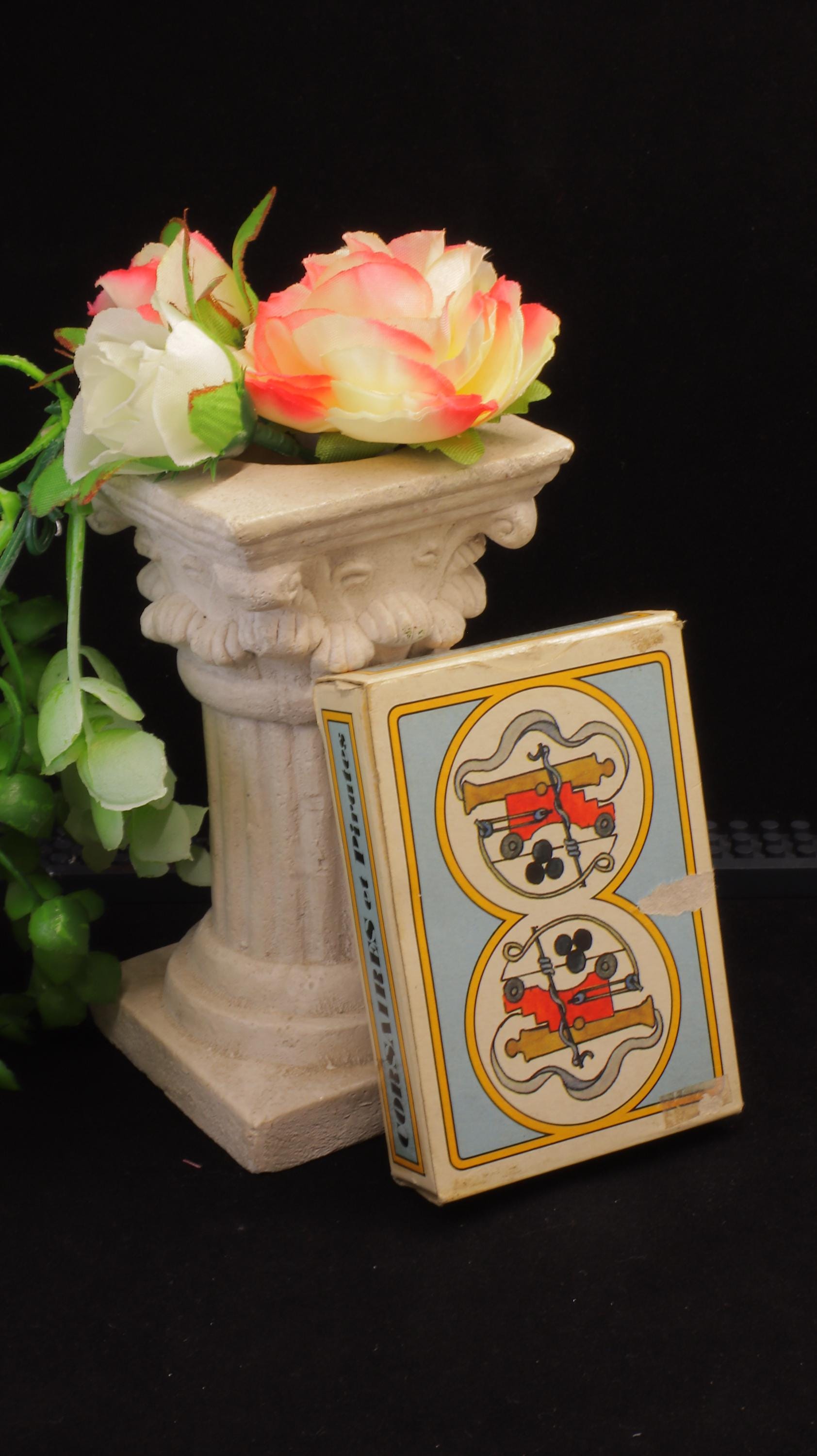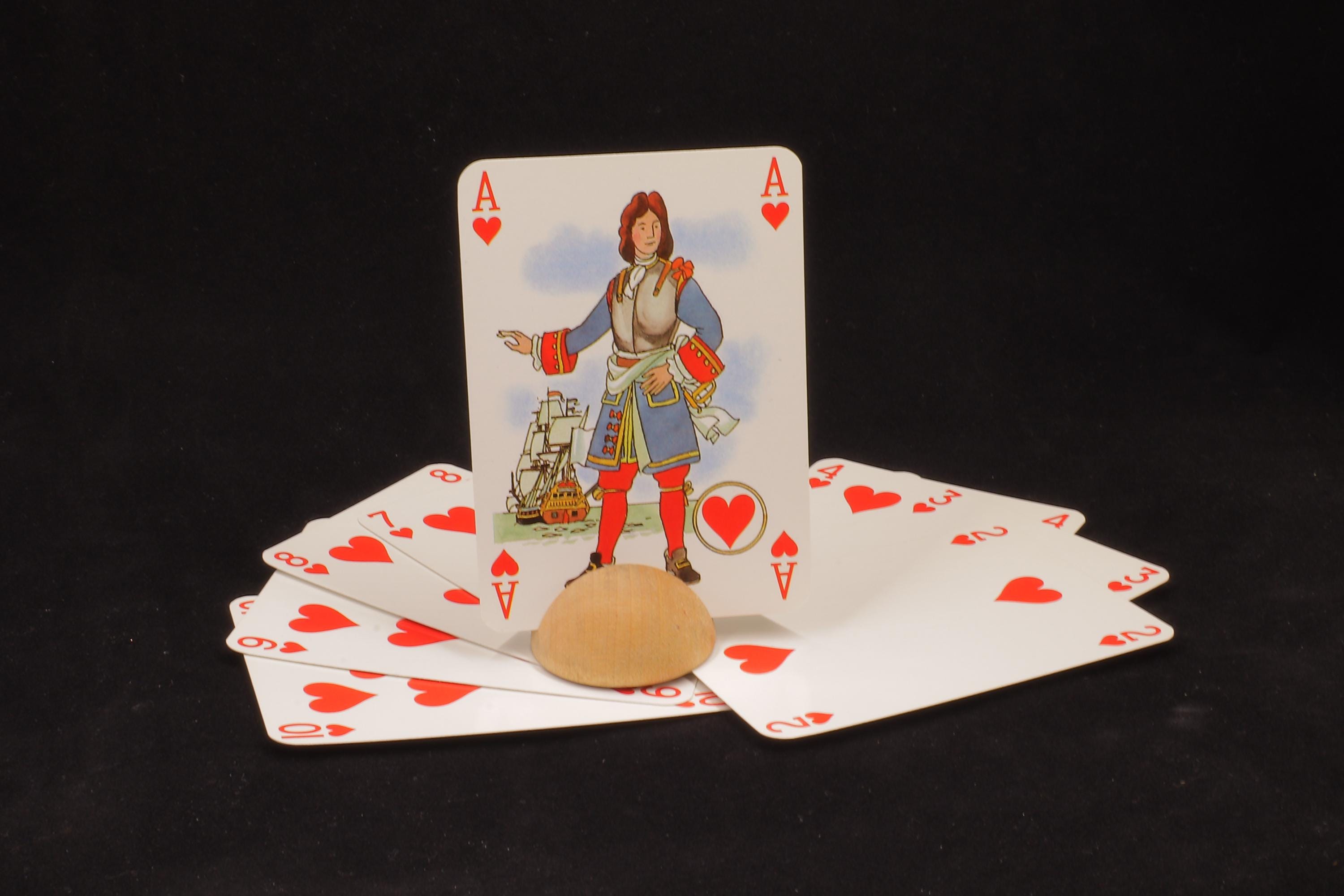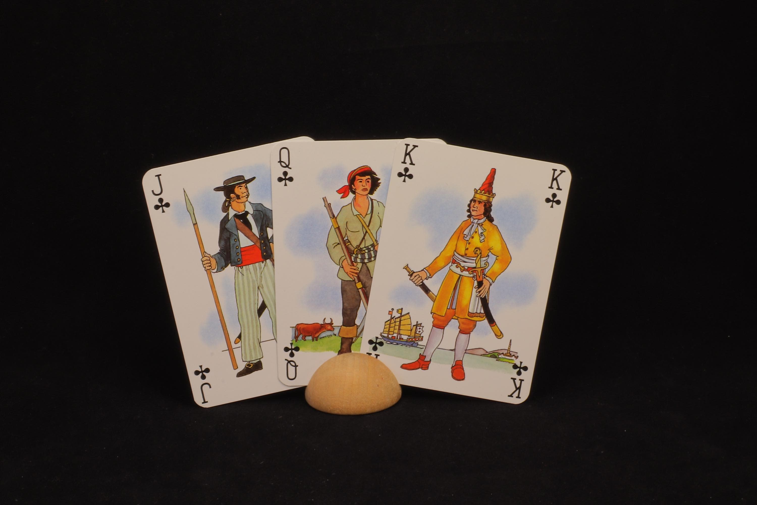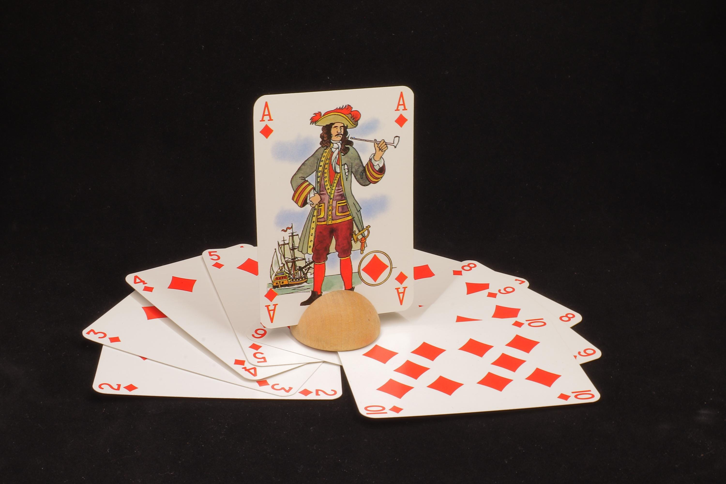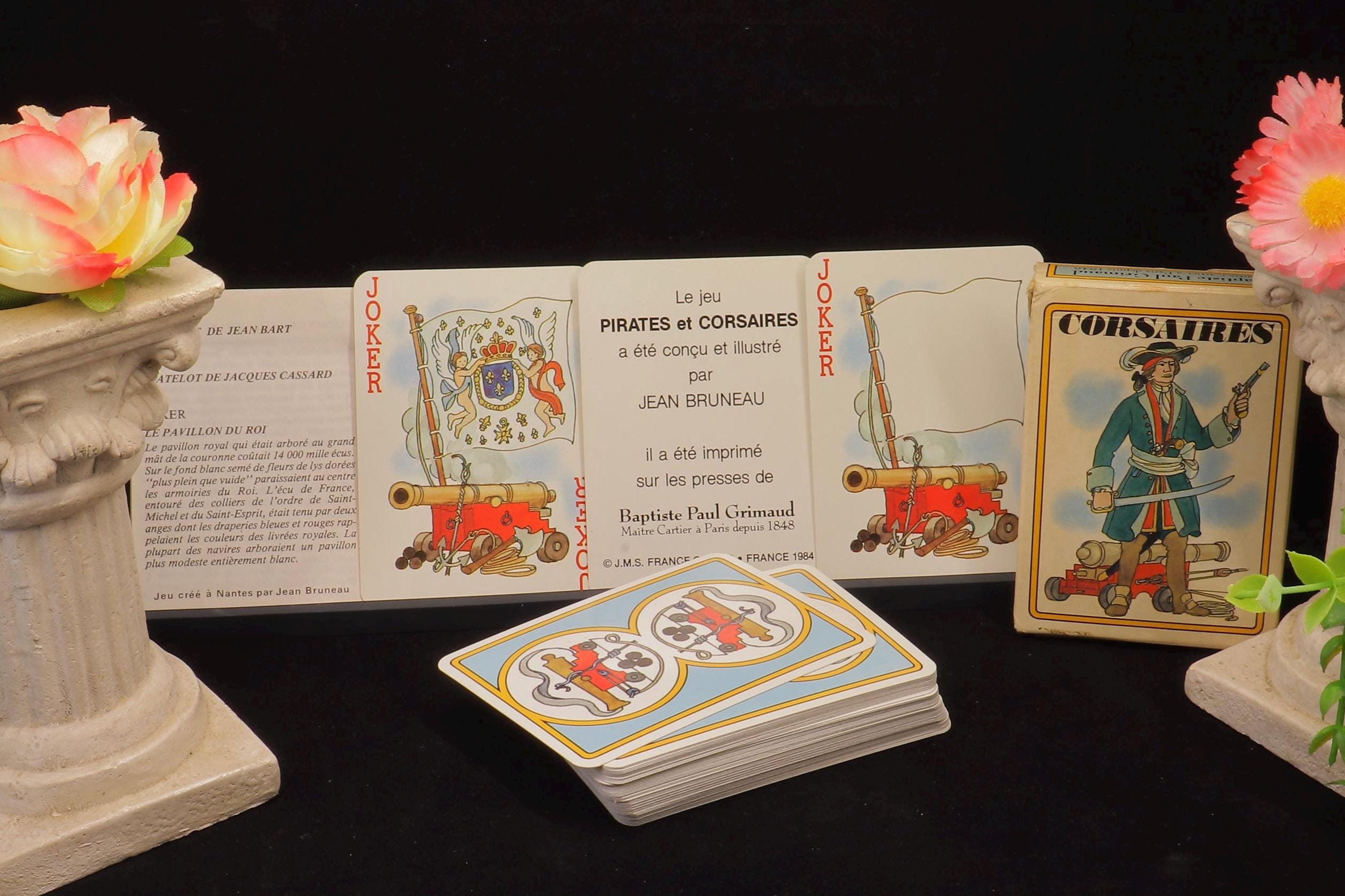 This deck is made by Grimaud Paris France. The court cards and the aces are illustrated with pirates and on the enclosed flyer you can see who these pirates would be. The language is French and it is a beautiful, cool and fun set of playing cards. Certainly for the collector of playing cards!