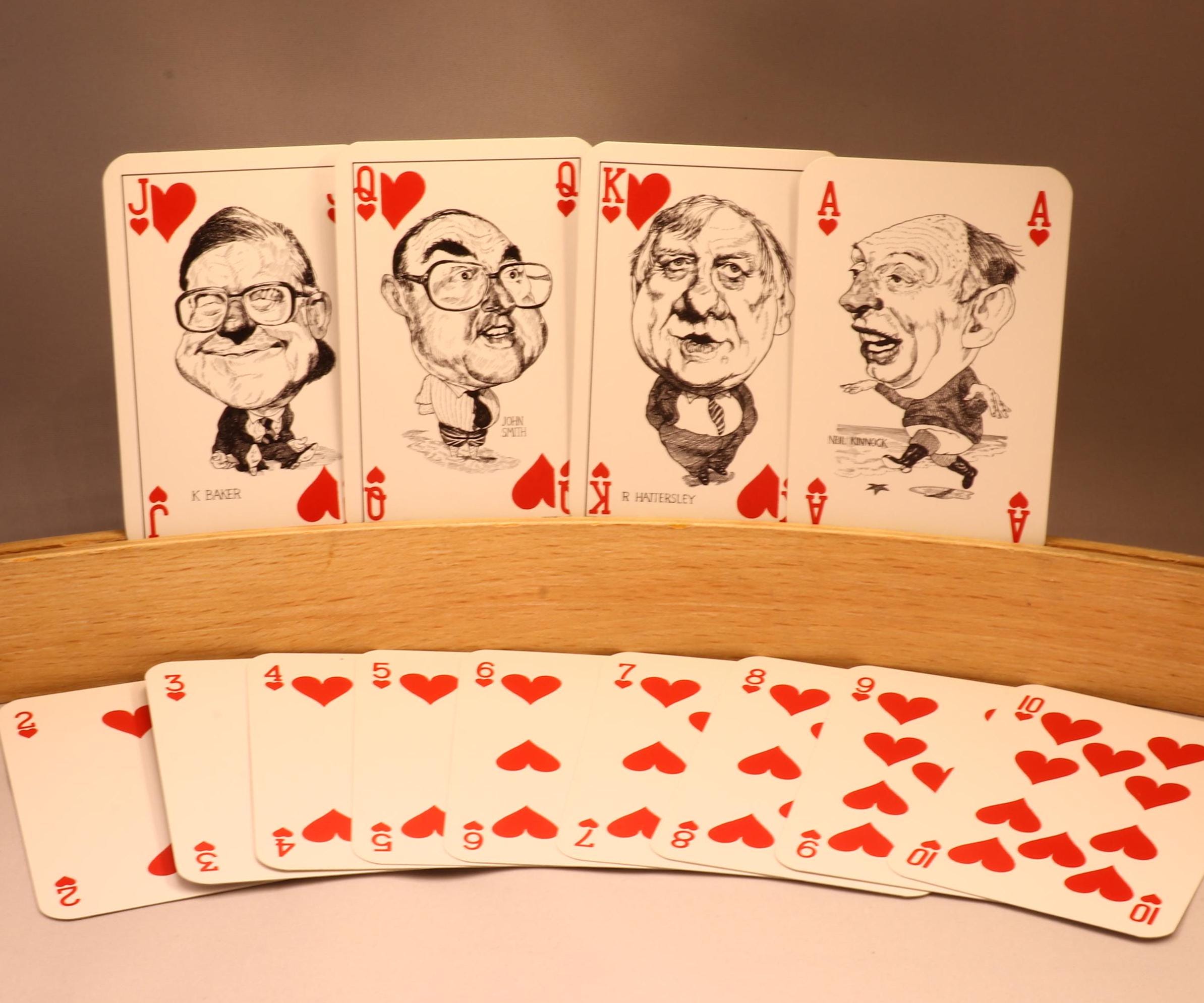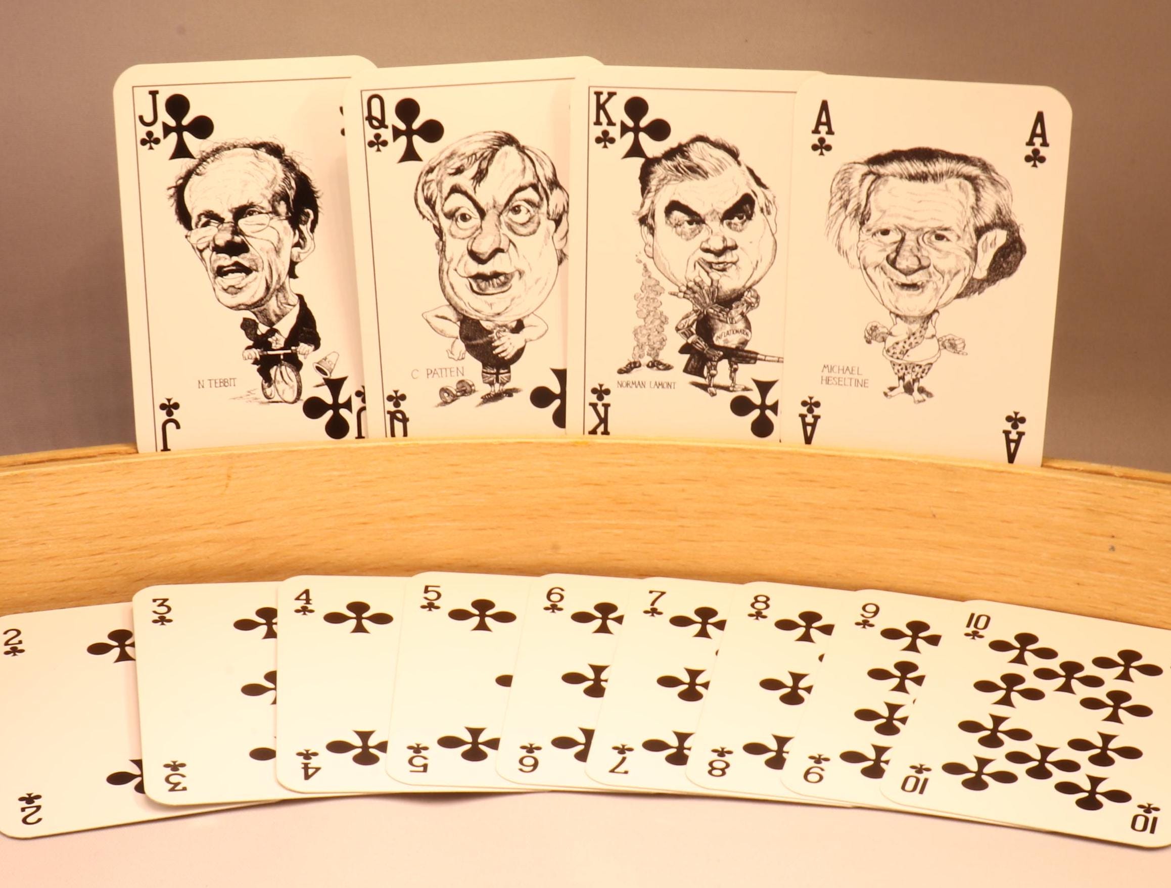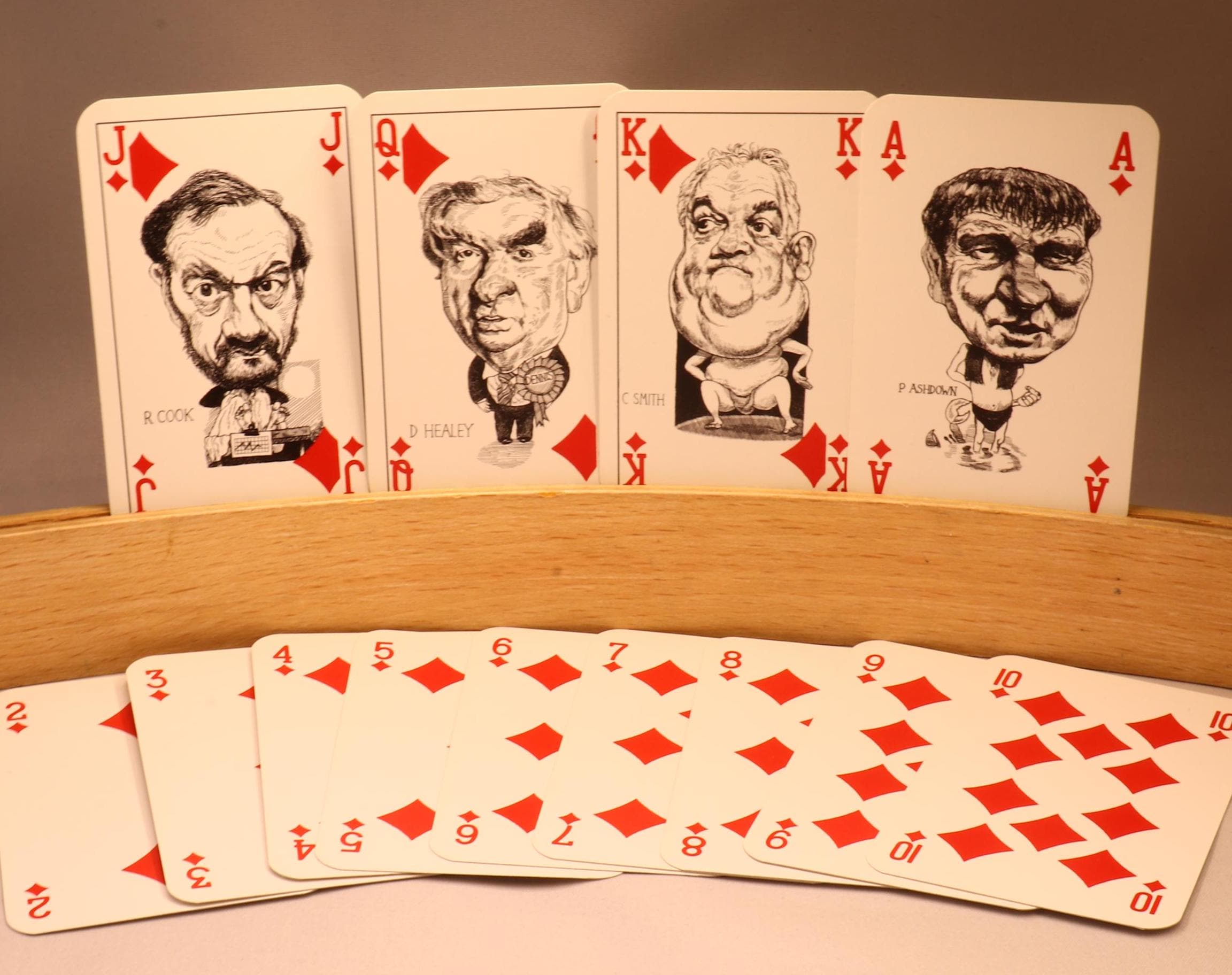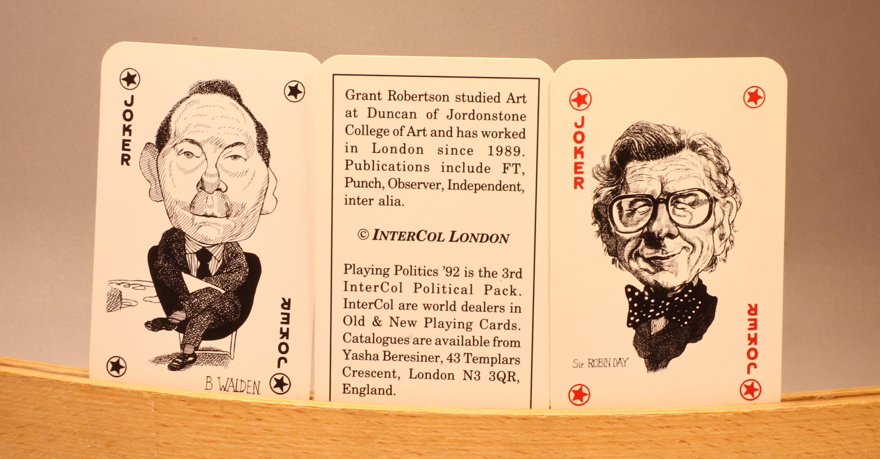 Intercol London released this beautiful deck of cards to commemorate the 1992 UK elections. The aces, jokers and court cards are illustrated with famous figures who were in politics in 1992.