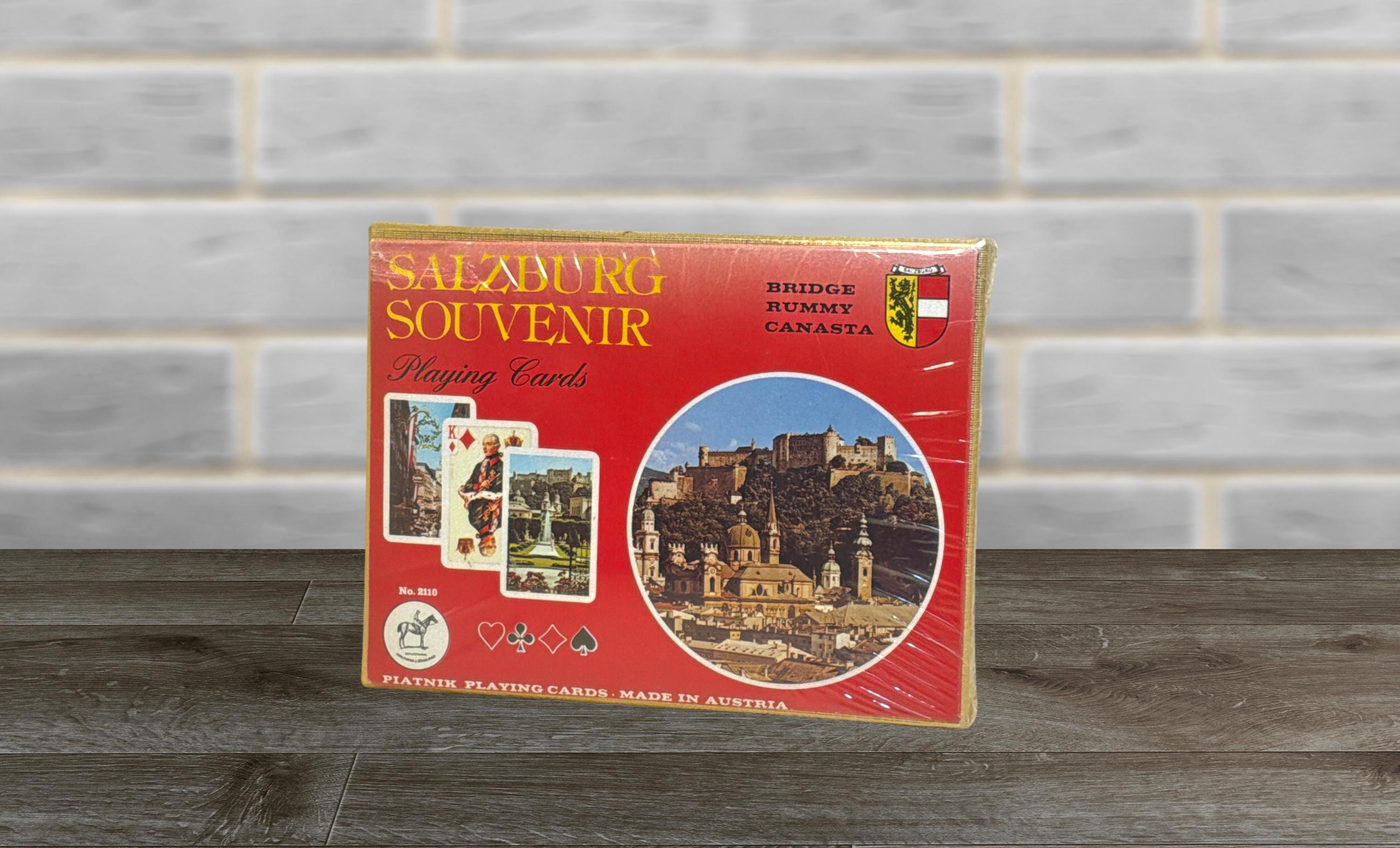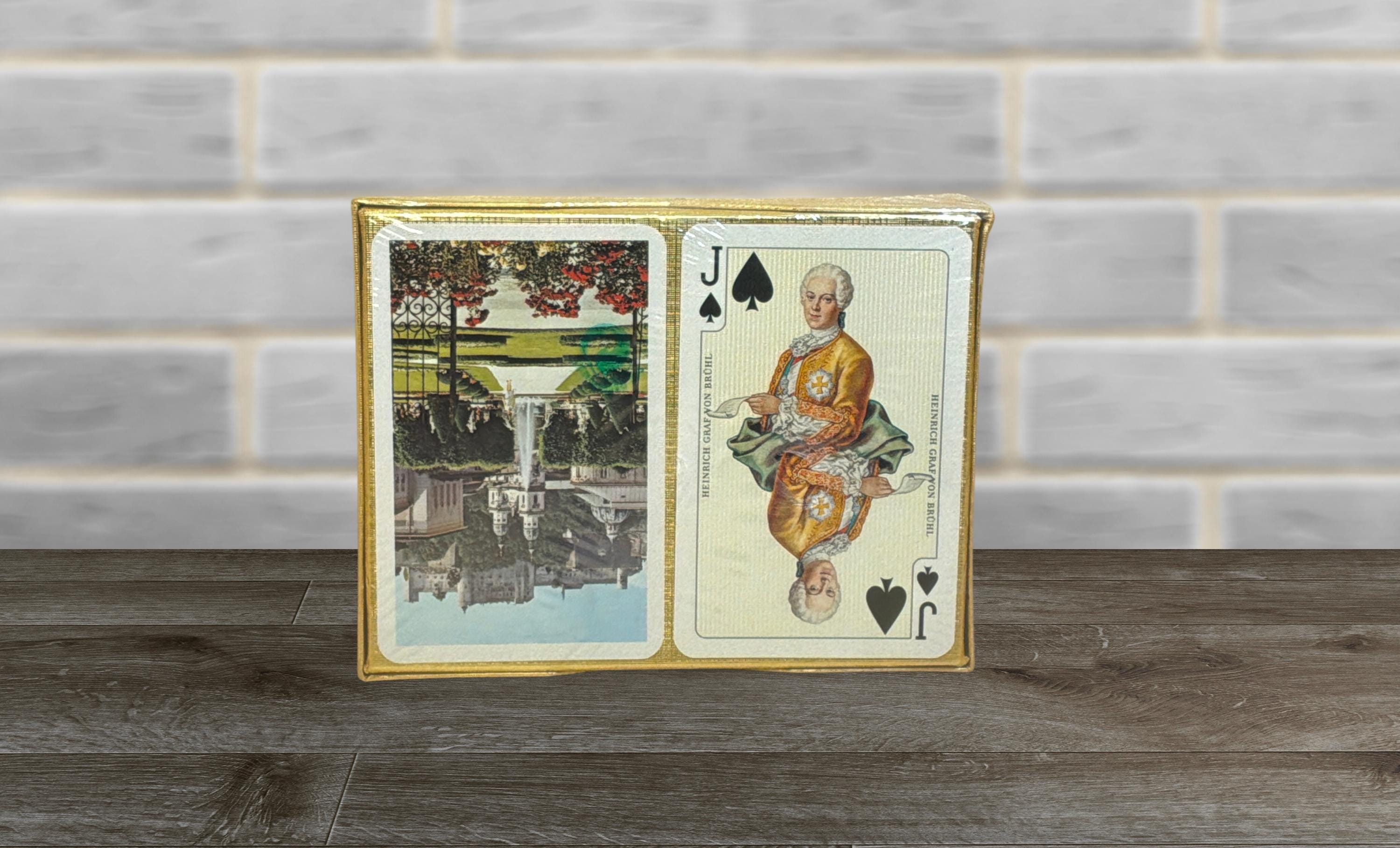 The cards come in a cellophane-wrapped box. The deck, made by Piatnik, is number 2110 and features Royals, Nobility, Kings, and Queens. Whist Rummy, Bridge, and Canasta are also available.