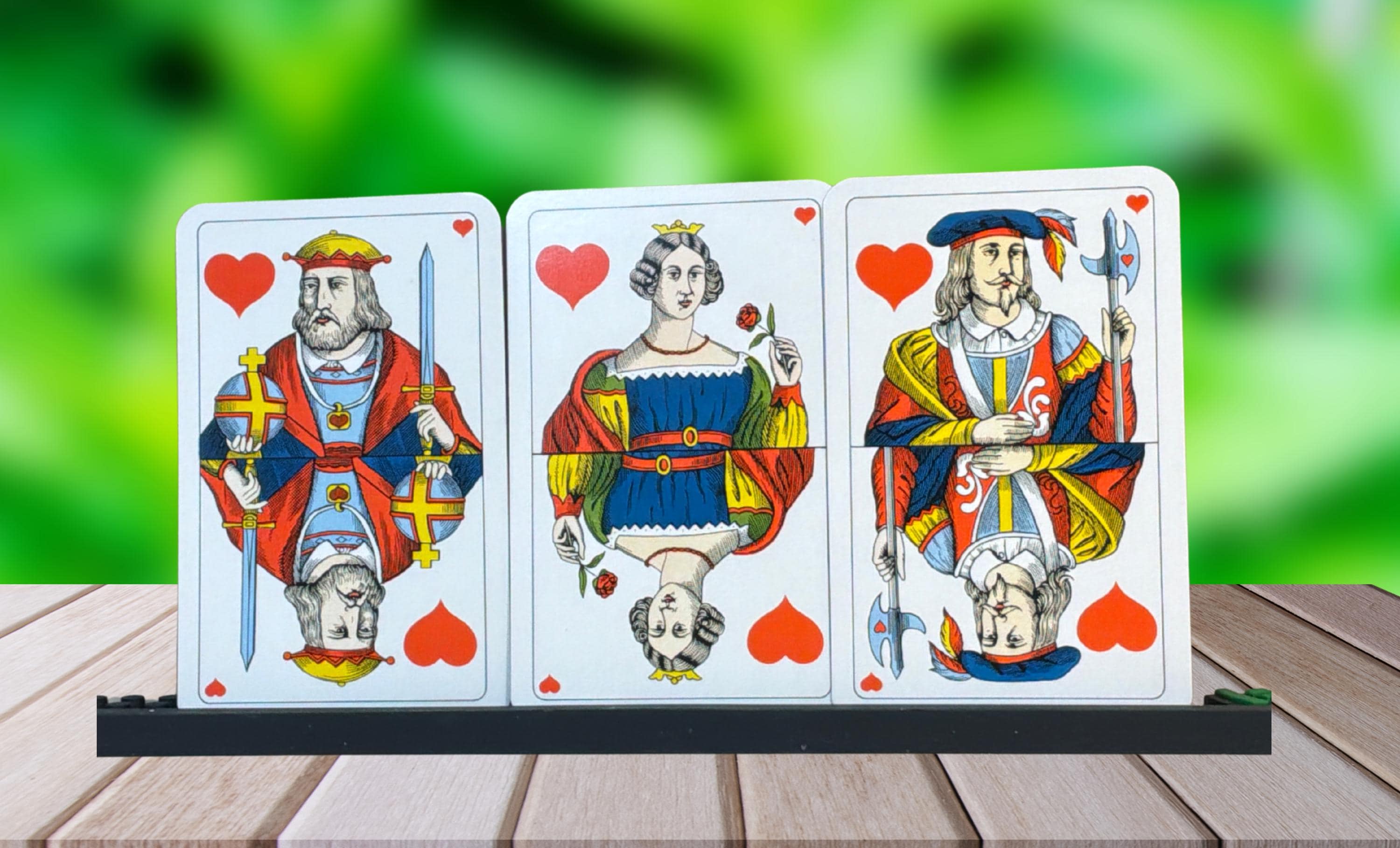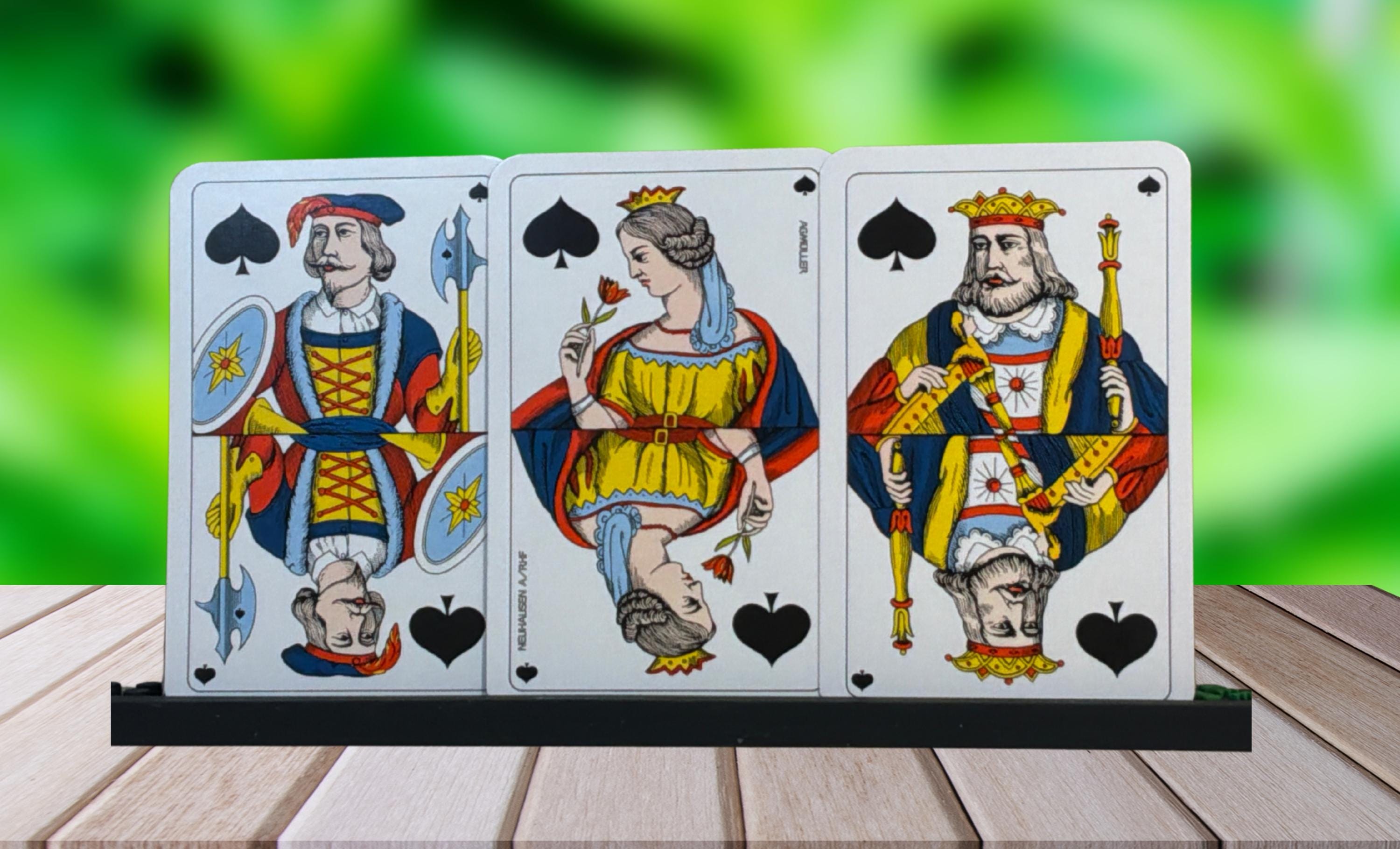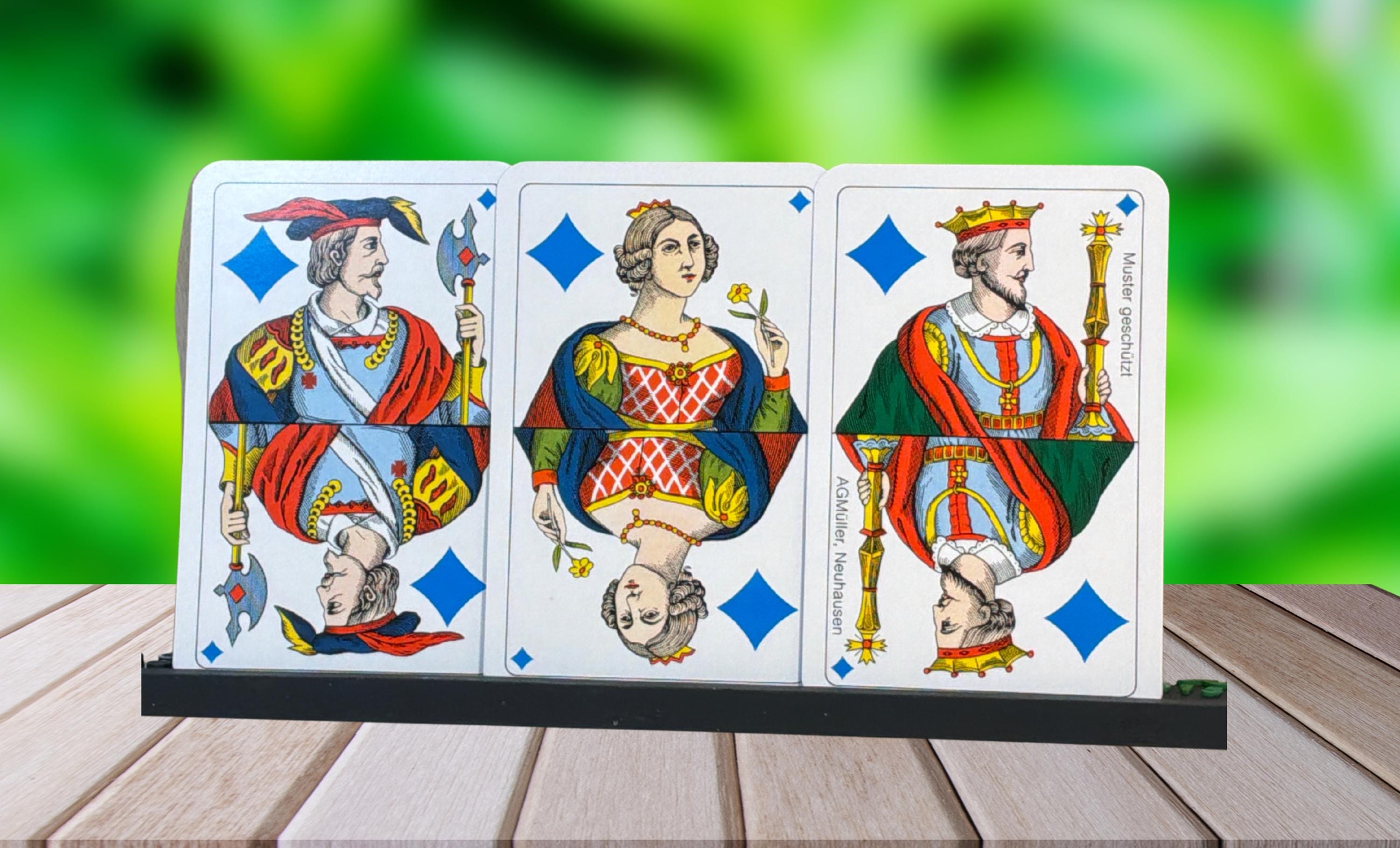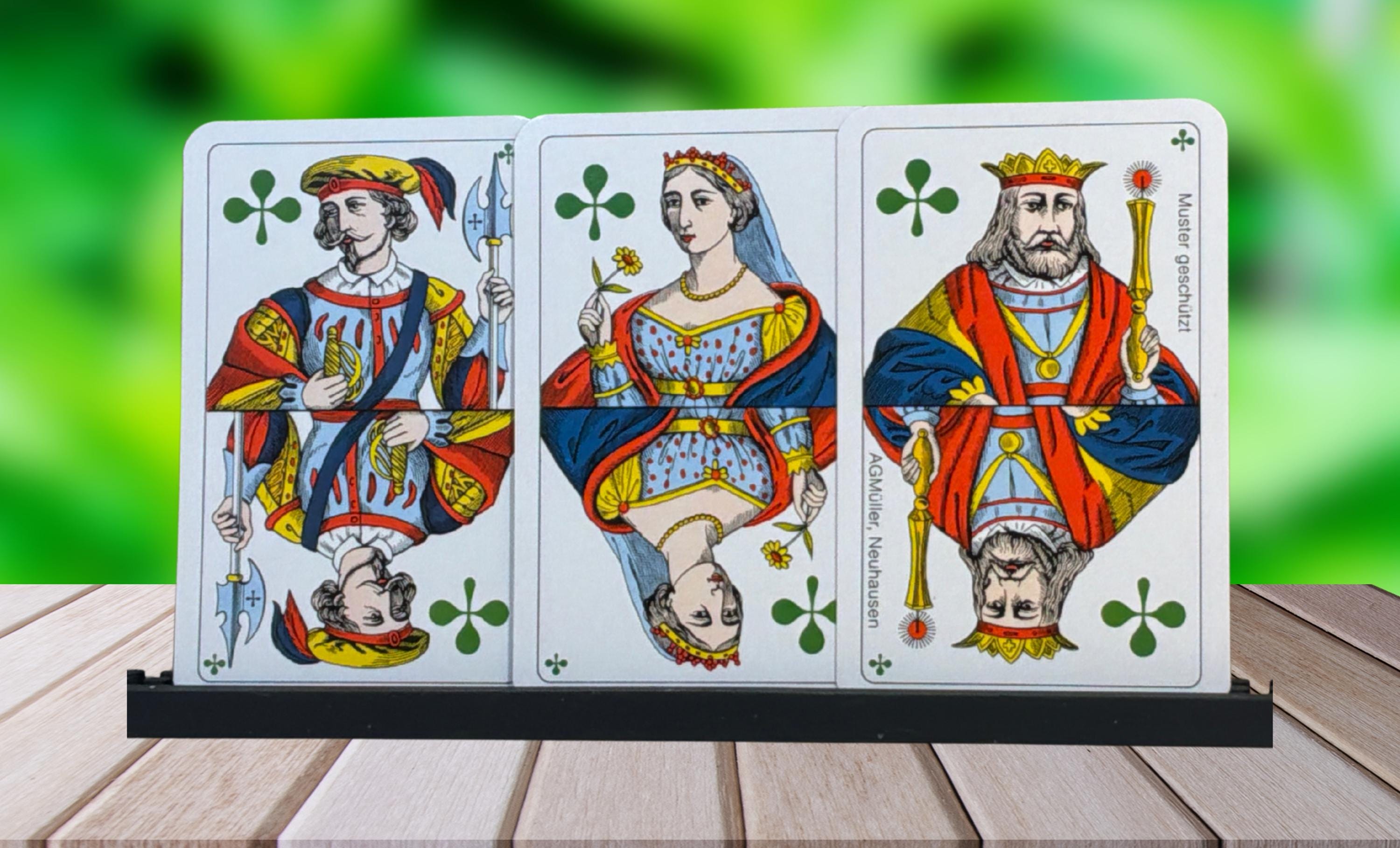 AG Muller Neuhausen Switzerland. A unique deck because of its unusual colors. The club symbols are green, and the diamond symbols are blue instead of red. A rare deck without indicators. The cards are in good condition (B) in a plastic box and sealed bag.