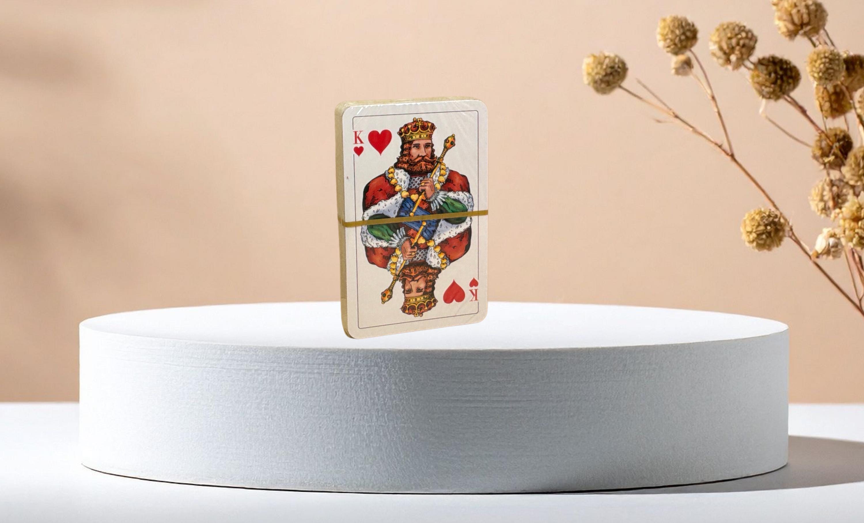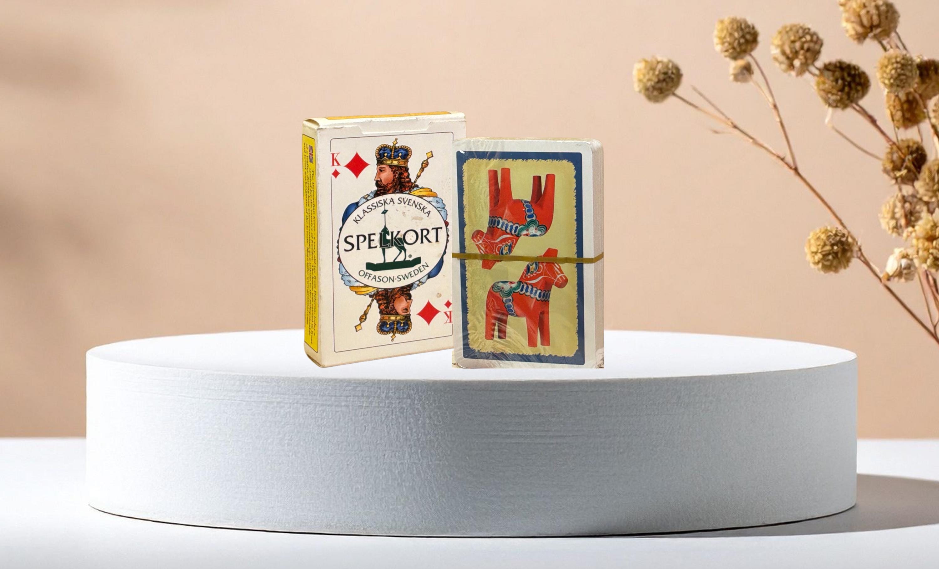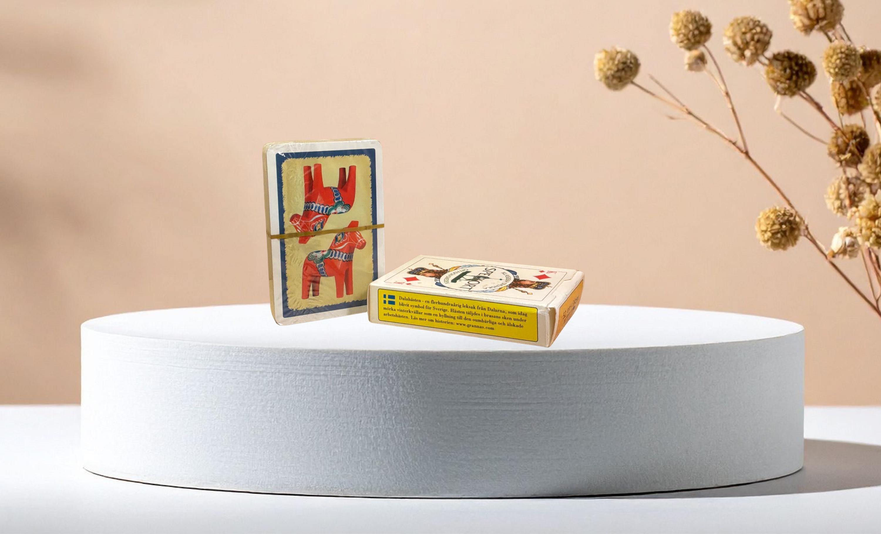 These playing cards are NEW AND CELLOPHANE-WRAPPED, in their original box. On the back of the cards, we see the DALECARDIAN HORSE, an old Swedish toy symbolizing Sweden. It's a tribute to the horse that worked hard during the winter months.